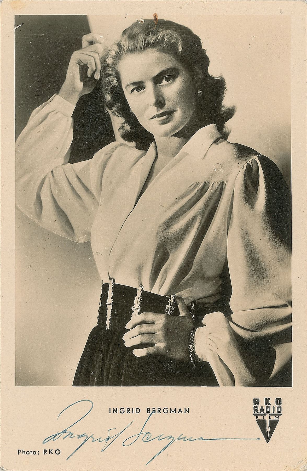Vintage semi-glossy 3.5 x 5.5 RKO Radio publicity postcard photo of Bergman in a lovely half-length pose, signed in the lower border in black ink. In fine condition, with a slightly rusty tack hole touching the top of Bergman's hair.