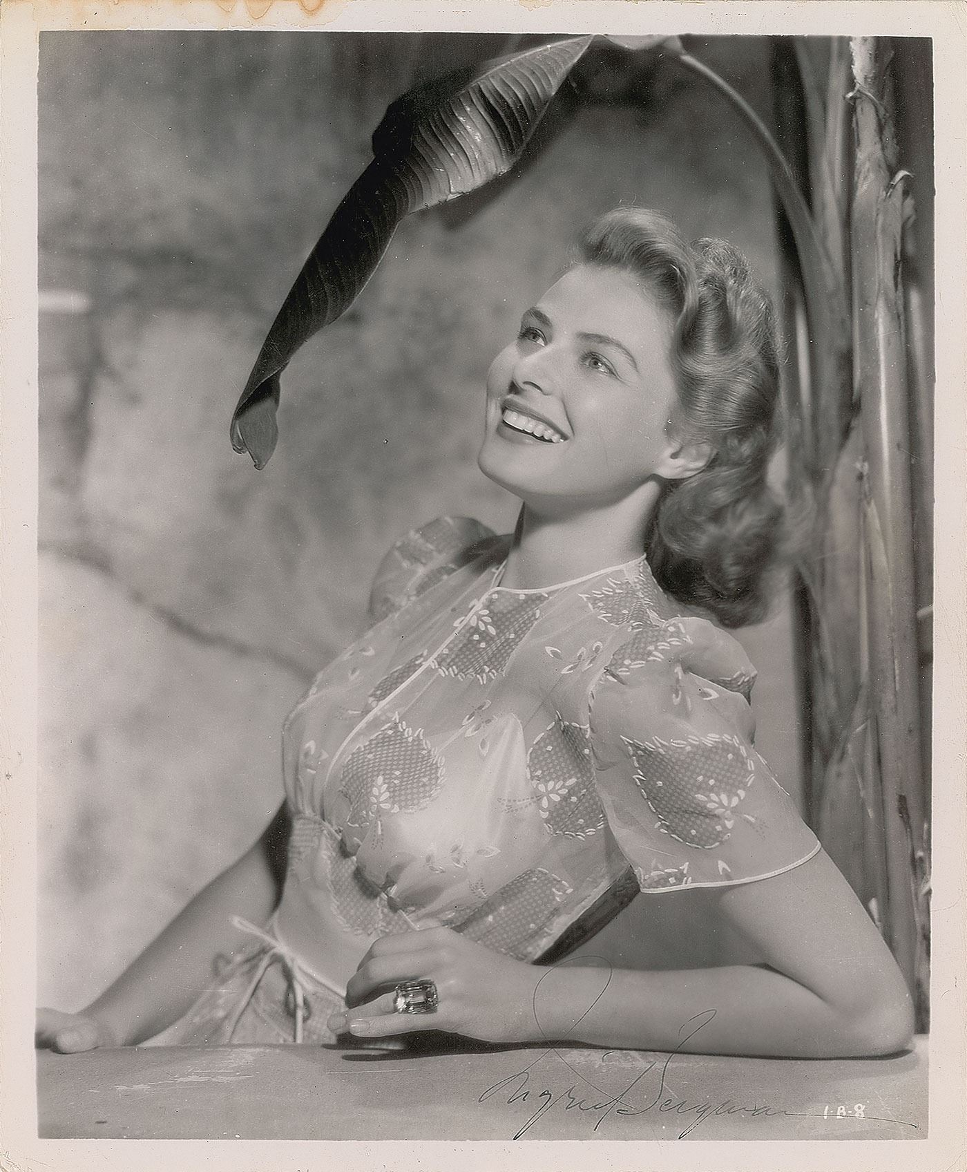 Vintage glossy 8.25 x 10 photo of Bergman in a radiant half-length pose, signed in fountain pen. In very good to fine condition, with scattered light creasing and crazing, stains to the top border, and the signature a bit light.