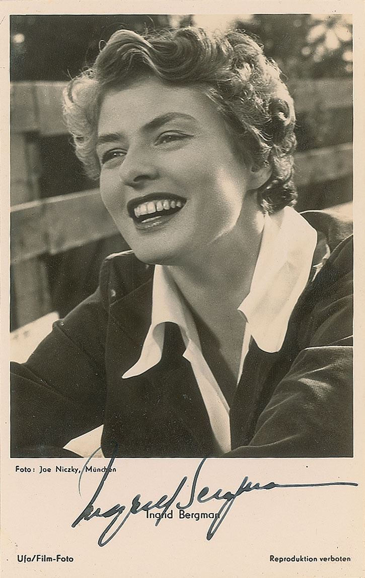 Attractive pearl-finish 3.5 x 5.5 postcard photo of Oscar-winning actress Ingrid Bergman in a cheerful up-close pose, signed boldly in fountain pen. In fine condition, with light silvering to darker areas of the image.