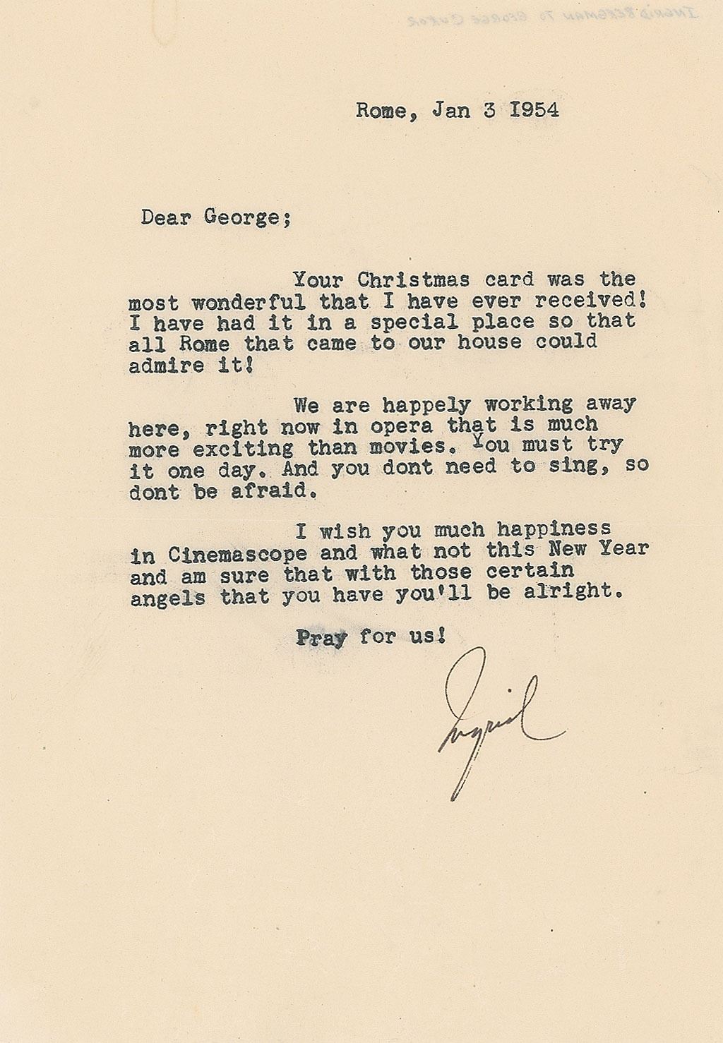TLS signed “Ingrid,” one page, 5.75 x 8.25, January 3, 1954. Letter to director George Cukor, in part: "Your Christmas card was the most wonderful that I have ever received! I have had it in a special place so that all Rome that came to our house could admire it! We are happily working away here, right now in opera that is much more exciting than movies. You must try it one day. And you don't need to sing, so don't be afraid. I wish you much happiness in Cinemascope and what not this New Year and am sure that with those certain angels that you have you'll be alright." In very good to fine condition, with some light creasing. During this period, Bergman was appearing in Arthur Honegger's oratorio Jeanne d'Arc au bûcher.