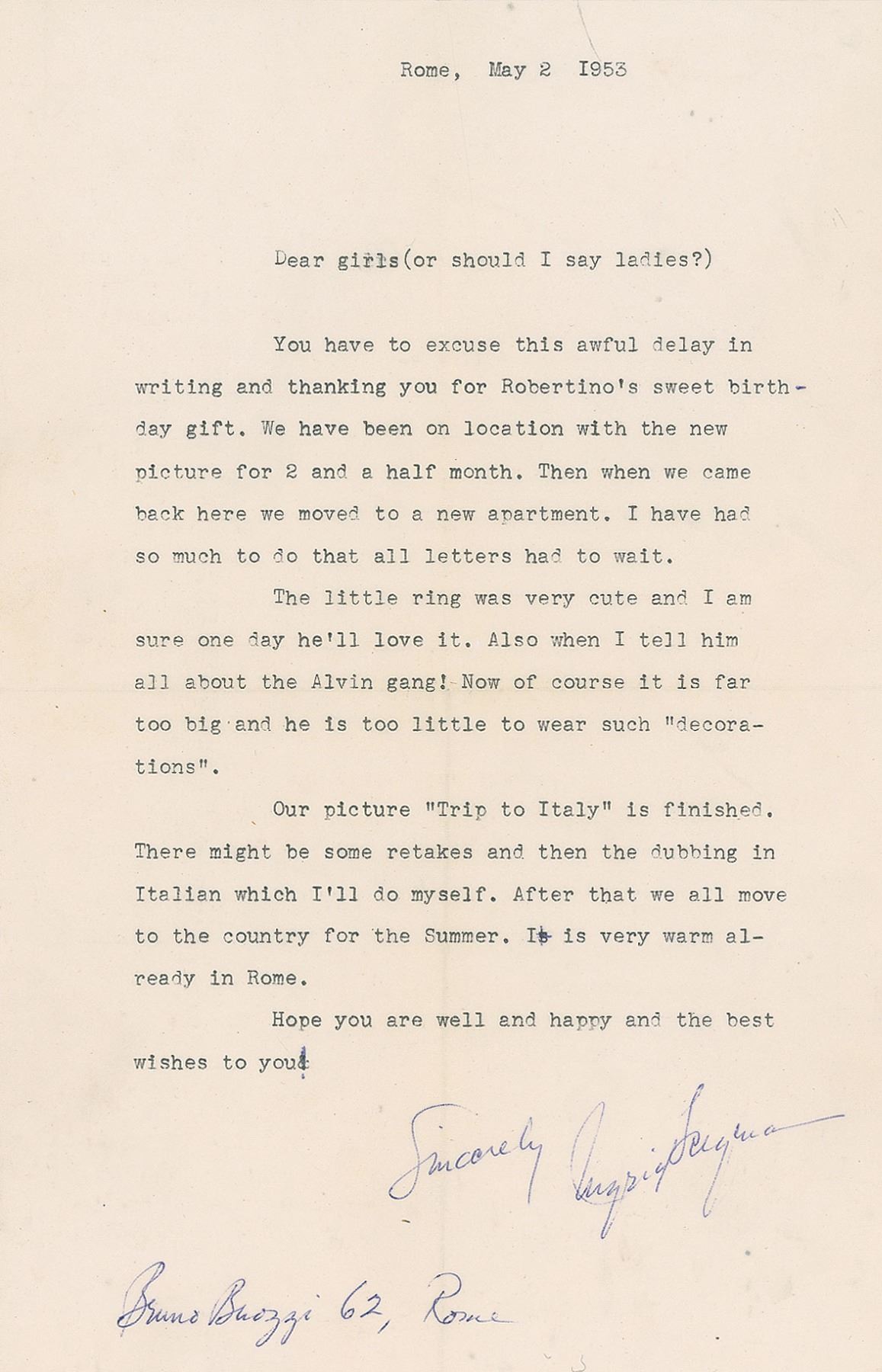 TLS, one page, 7 x 11, May 2, 1953. Letter to Miss Viola Leone in New York, written from "Bruno Buozzi 62, Rome," in part: "You have to excuse this awful delay in writing and thanking you for Robertino's sweet birthday gift. We have been on location with the new picture for 2 and a half months. Then when we came back here we moved to a new apartment. I have had so much to do that all letters had to wait. The little ring was very cute and I am sure one day he'll love it…Our picture 'Trip to Italy' is finished. There might be some retakes and then the dubbing in Italian which I'll do myself. After that we all move to the country for the Summer. It is very warm already in Rome." In fine condition. Accompanied by the original mailing envelope, a gorgeous unsigned 1945 RKO promo photo, and an unsigned program for Joan of Arc. Written and directed by Bergman's husband Roberto Rossellini, Journey to Italy was released in 1954 and received poorly by critics and audiences. Today, it is widely considered to be Rossellini's masterpiece and a landmark piece of cinema.