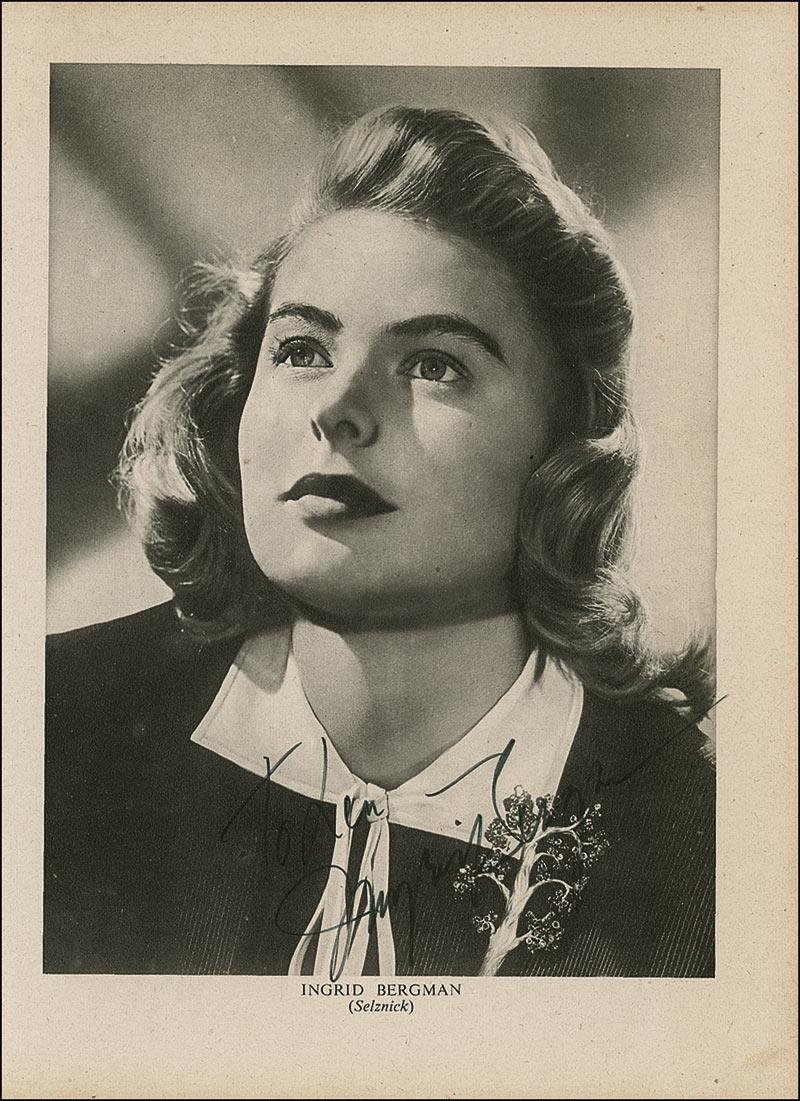 Pretty 7 x 9.75 book photo of the young actress, signed and inscribed in black felt tip “To Len, Ingrid Bergman.” In fine condition, with light contrast to signature and inscription, and some scattered light toning and foxing to borders.