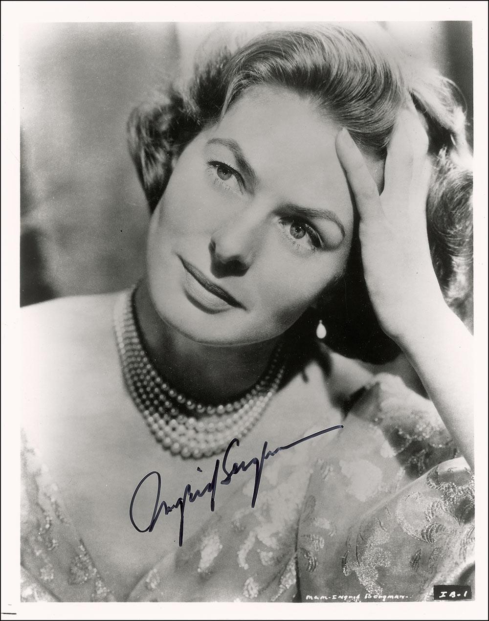 Attractive glossy 8 x 10 portrait of Bergman resting her head on her hand, signed in black felt tip. In fine condition, with bend at the lower left corner and a few scattered surface marks.