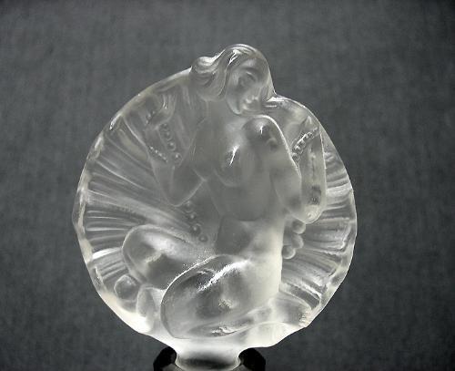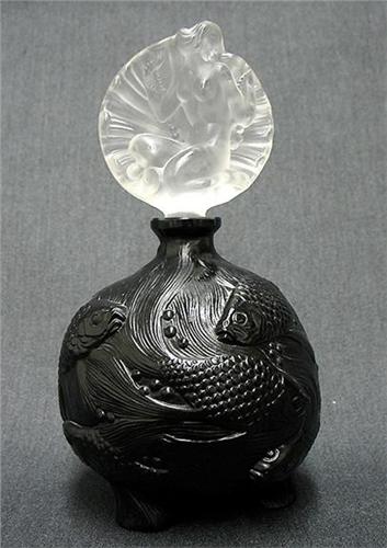 Ingrid Czechoslovakia perfume bottle in black crystal round form with raised goldfish design; on three feet; frosted crystal stopper with seated nude on clamshell; with dauber; acid stamped Ingrid Czechoslovakia on one foot; 1920's; 8" high (chip on top of dauber)