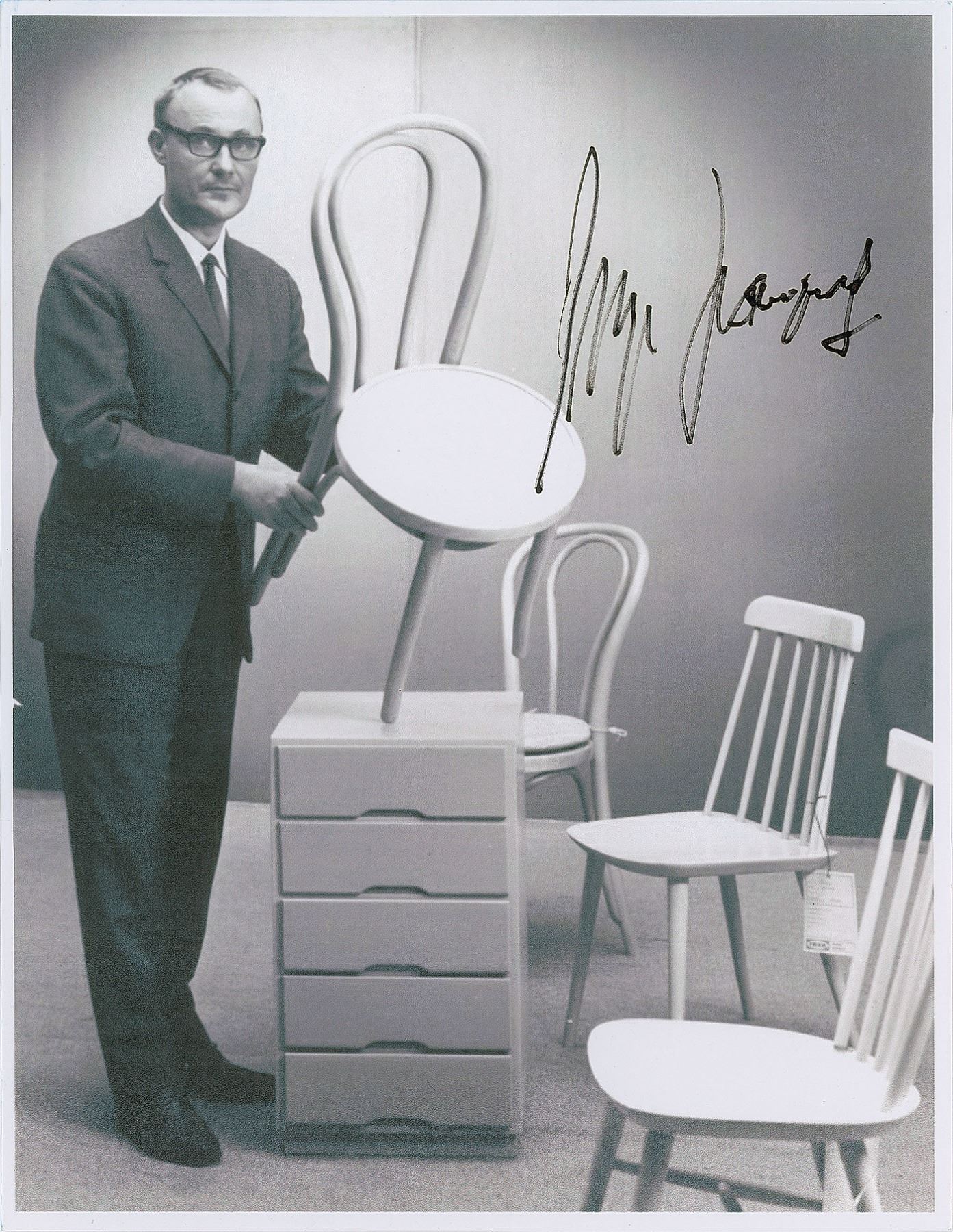 Swedish business magnate (1926–2018) who founded the innovative retail furniture company IKEA. Uncommon 8.5 x 11 laserprint photo of Kamprad in an early full-length pose with some of his furniture, signed in black felt tip. In very fine condition.