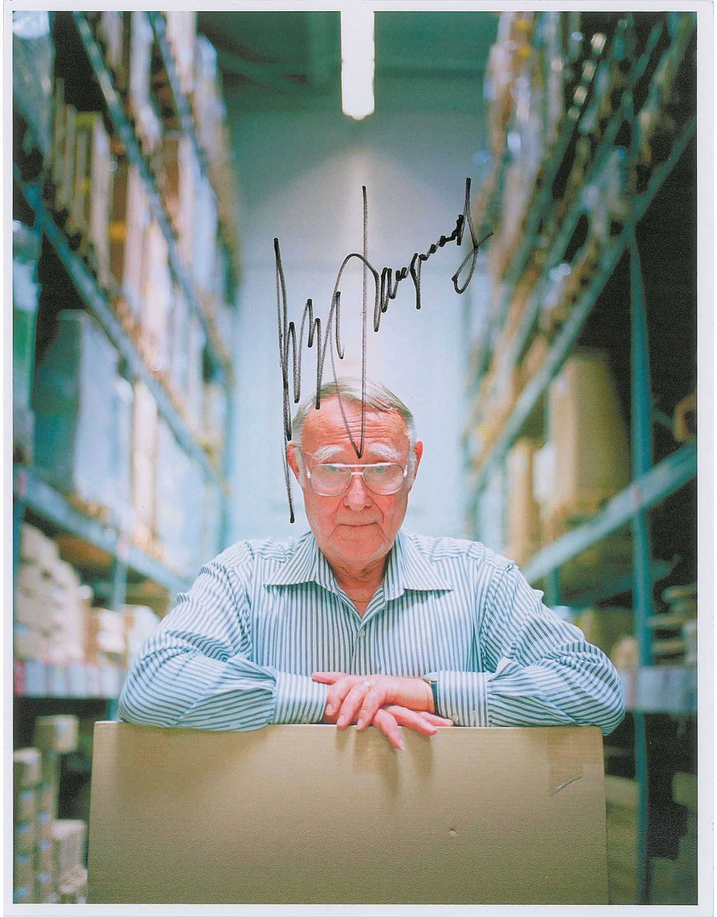 Swedish business magnate (1926–2018) who founded the innovative retail furniture company IKEA. Uncommon 8.5 x 11 laserprint photo of Kamprad posing inside one of his furniture warehouses, signed in black felt tip. In very fine condition.