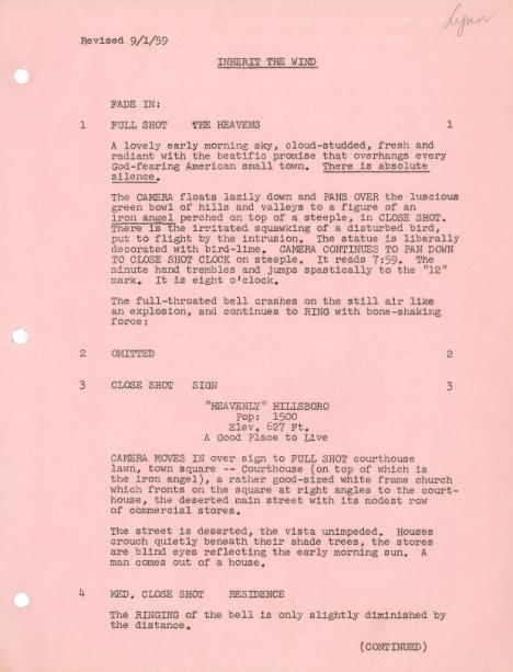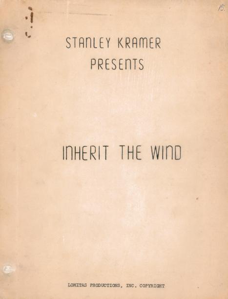 "Inherit The Wind" Movie Script / Revised September 1, 1959 / Stanley Kramer Presents / Lomitas Productions, Inc. / Starring Spencer Tracy, Fredric March, Gene Kelly / Inside script pages are in good condition {8 1/2" x 11"}