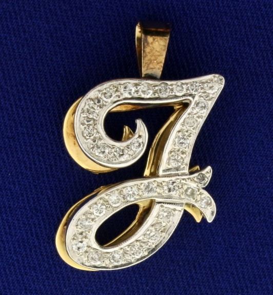In 14k white and yellow gold, containing thirty one diamonds ranging from .01ct to .02ct. 1 1/4 inch long with bale. 3/4 inches wide. 7.8g.
