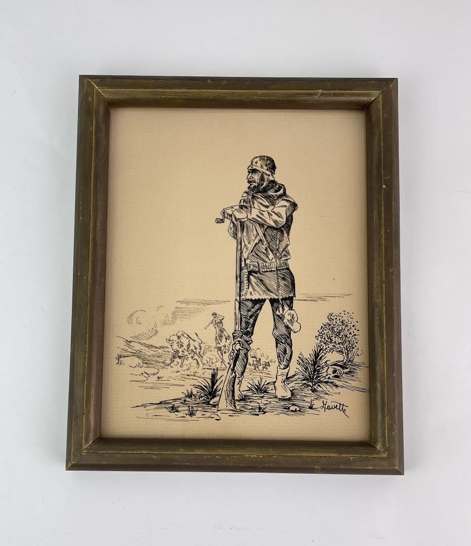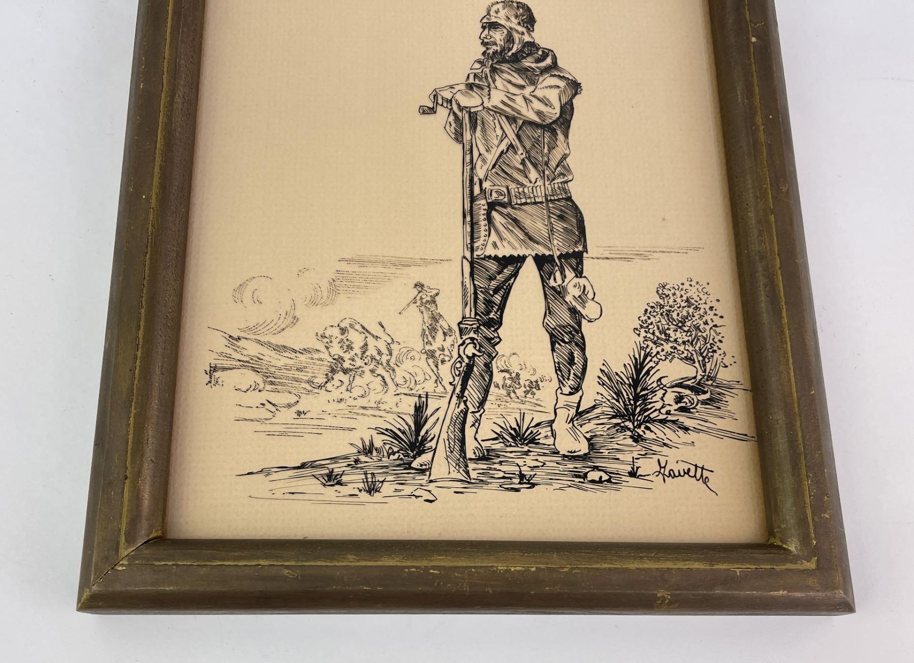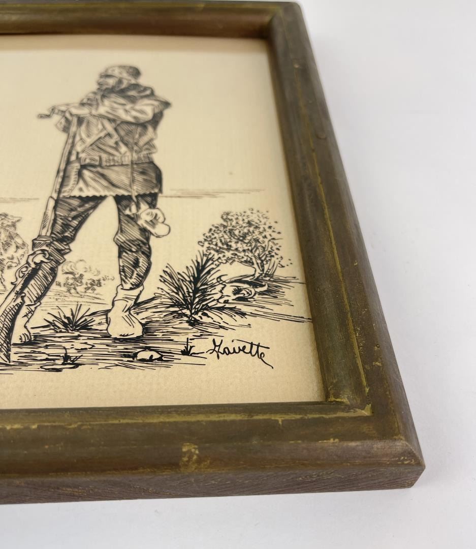 Neat drawing. Signed as shown. Man hunting a buffalo in the background. 9" by 11" framed.