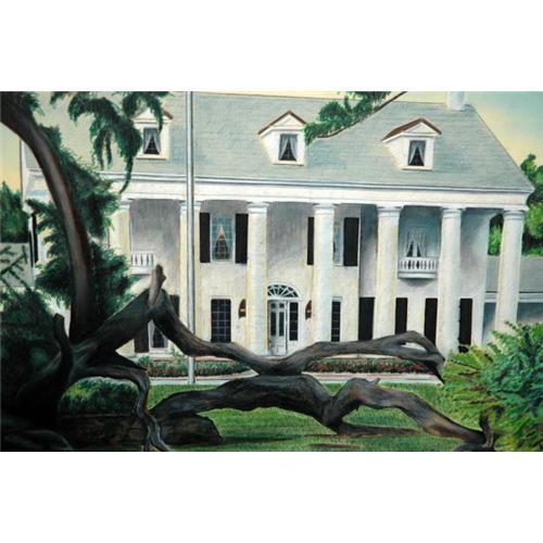Large Ink painting of an old Southern Mansion with old downed tree. The colors are vibrant with precise details and shading. It is mounted & matted and measures 28 1/4 x 22 1/4 including the mat. I cannot find a signature which is too bad as it is very well done. One would think that the artist would like to claim credit for such a lovely piece of visual art.<p> The condition is good. There is a small flaw in the paper on the third column from the left next to the flag pole. It like a wrinkle. I first though it was a drawn in crack in the column but it has a texture so I am thinking that is was a small tear that was repaired from the back or is is a wrinkle in the paper.