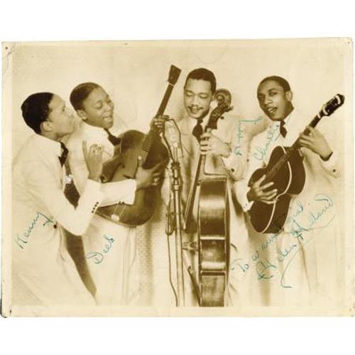 <B>Ink Spots Signed Photo.</B></I> A vintage b&w 8" x 10" photo of the vocal group that helped define early Rock and Roll and R&B music, inscribed and signed by "Hoppy" Jones, "Deek"Watson, Charlie Fuqua, and Bill Kenny in green ink. In Fine to Very Fine condition with moderate toning, mild to moderate corner and edge wear, and tack holes to the corners.<BR><BR><b>Shipping:</b> Flat Material, Small (<a target="_blank" href="http://www.heritageauctions.com/common/shipping.php">view shipping information</a>)