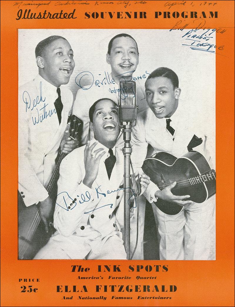 Vintage souvenir program from a performance of the Ink Spots and Ella Fitzgerald, 8.5 x 11, notated at the top in the collector’s hand, “Municipal Auditorium, Kansas City, Mo., April 1, 1944”. Signed on the front cover in fountain pen by Deek Watson, Orville Jones, Bill Kenny, and Bill Duggett. Fitzgerald has also signed inside, and the back cover bears signatures of Cootie Williams’s orchestra. In fine condition, with some light soiling and handling wear, as well as light rippling to covers.