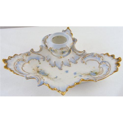 Inkwell. Porcelain. No Liner or top to well. Blurred makers Mark that is not readable. Very pretty decal under the glaze of blue flowers that are then hand accented. Heavy gilding. C1960? 1? tall X 9.1/2? wide X 7.1/2? deep.