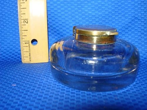 Glass Ink Well with Brass Hinged Top, measures 2" h