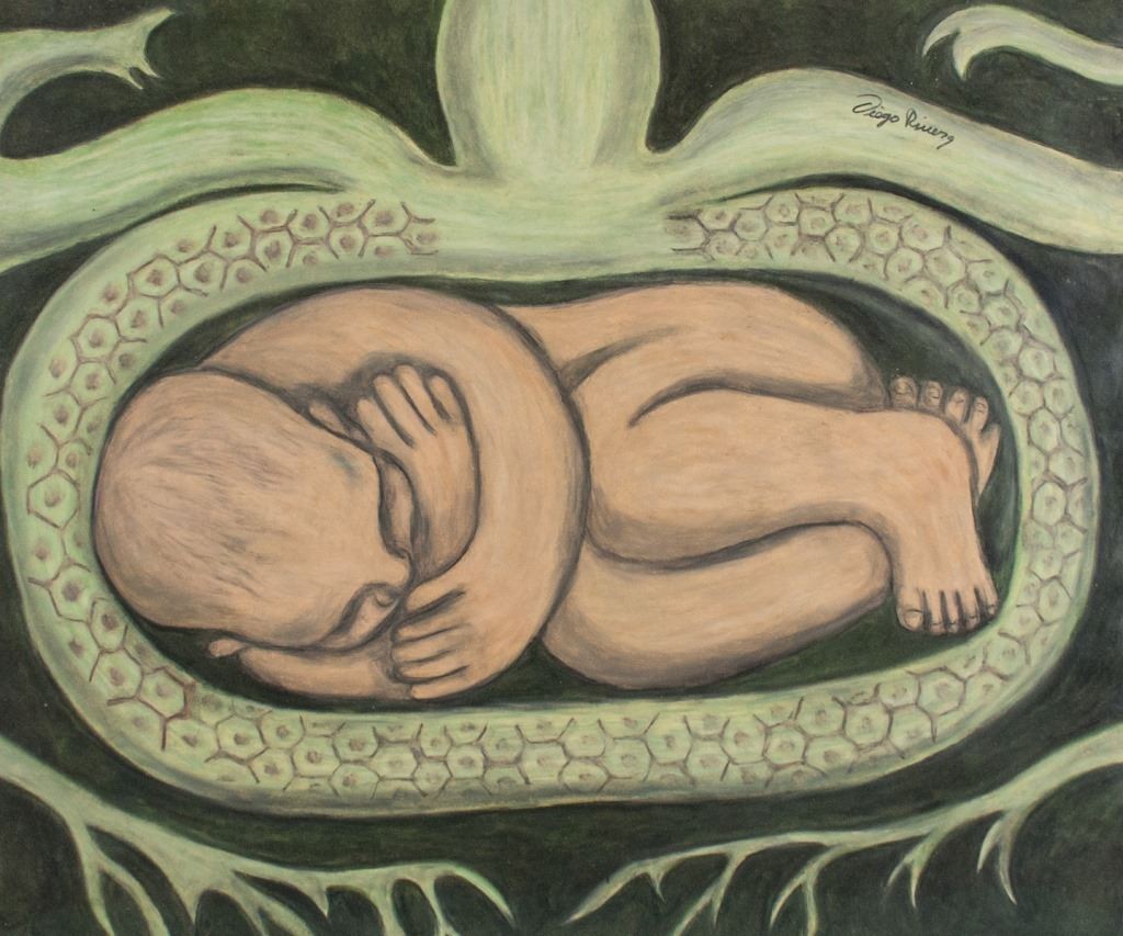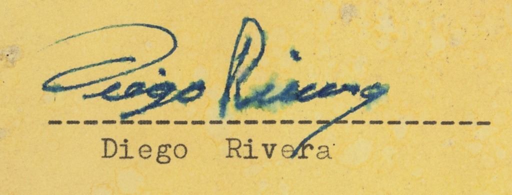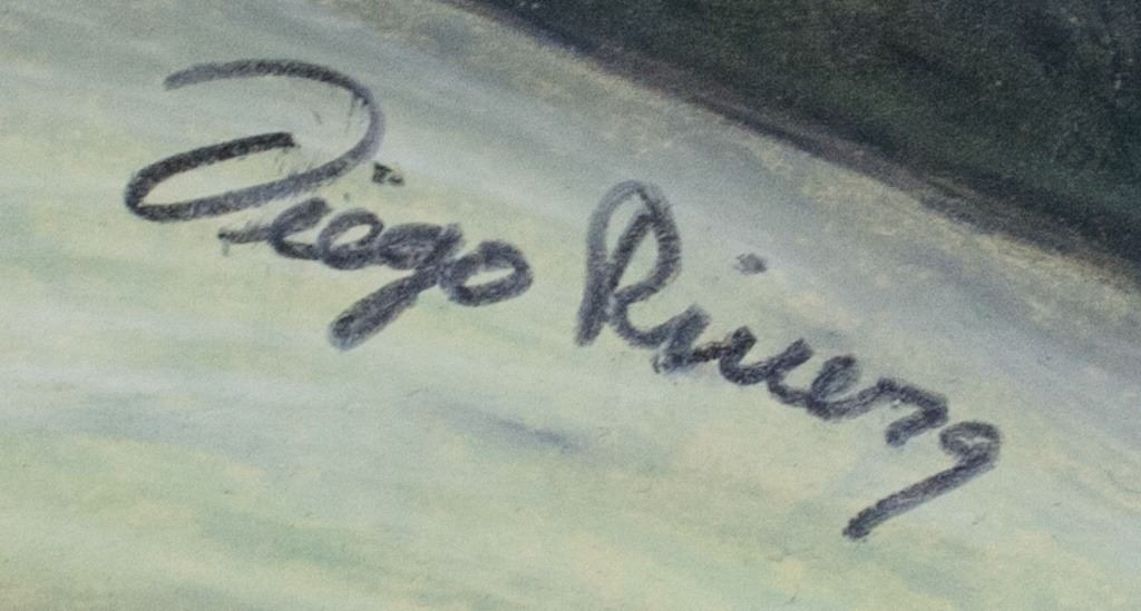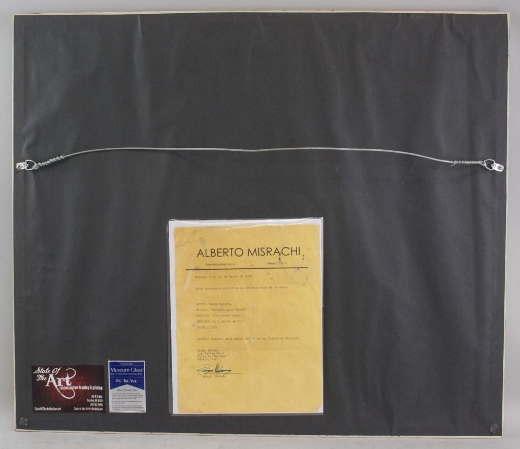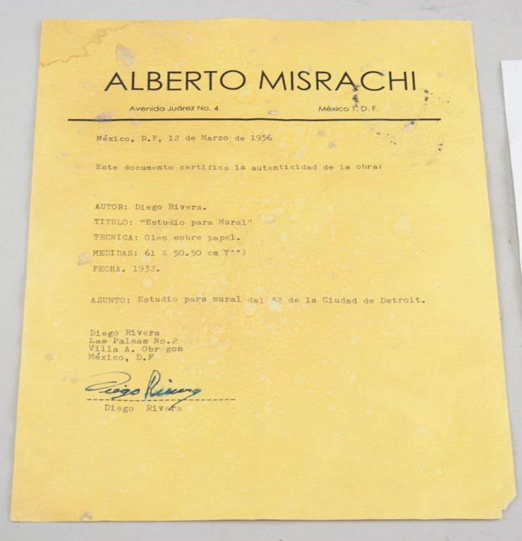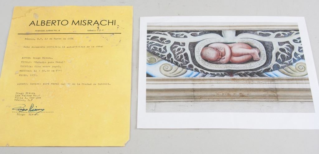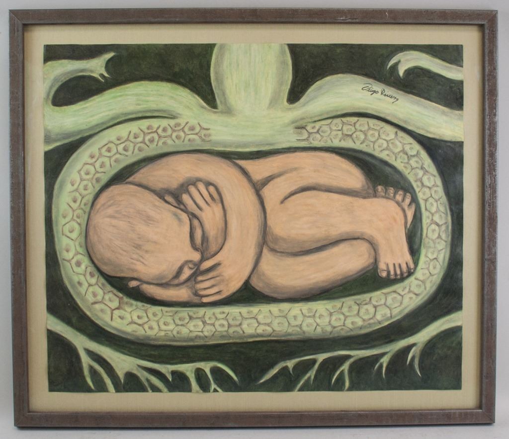 Ink and oil on paper, framed. Featuring a child curled up in a womb-like space. Signed "Diego Rivera" to the top right corner. Accompanied by certificate from "ALBERTO MISRACHI" which reads " Mexico, D.F. 12 de Marzo de 1956 / Este documento certifica la autenticidad de la obra: / AUTOR: Diego Rivera. / TITULO: Estudio para Mural / TECNICA: Oleo sobre papel. / MEDI DAS: 61 x 50.50 x cm T**) / FECHA. 1932. / ASUNTO: Estudio para mural del 32 de la Ciudad de Detroit / Diego Rivera / Las Palmas No. 2 / Villa A. Obr gon / Mexico, D.F / [SIGNATURE]." Paper size: 60 x 50 cm (23.5 x 19.5 inches). Frame size: 71 x 60 cm (28 x 24 inches).