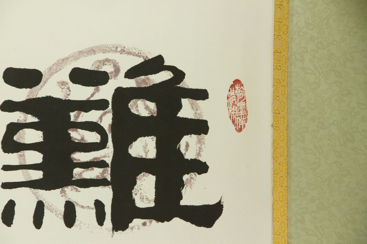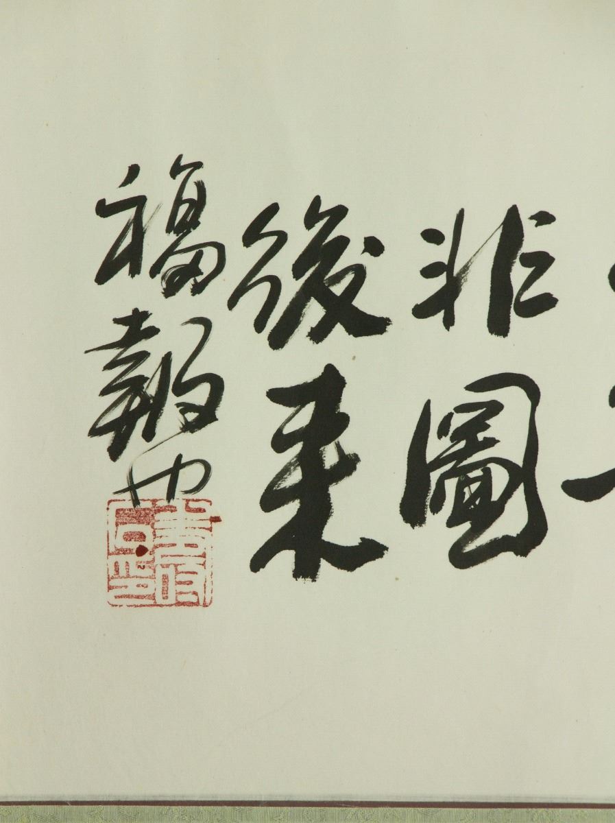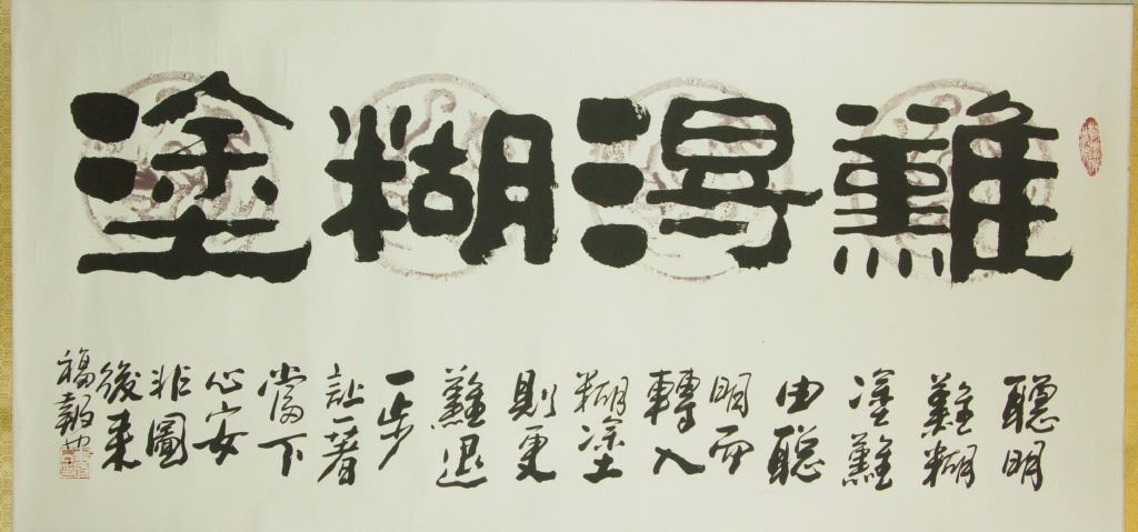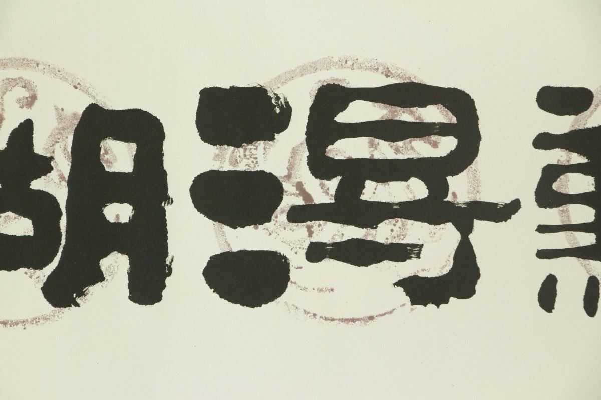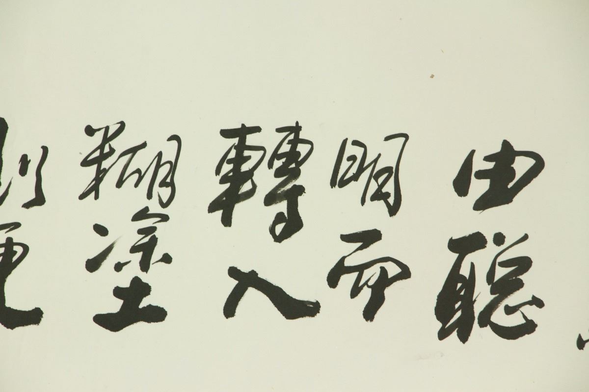 Clerical script calligraphy; Chinese ink on paper; horizontal scroll; signed and inscribed with two artist seals; 170 cm × 73 cm