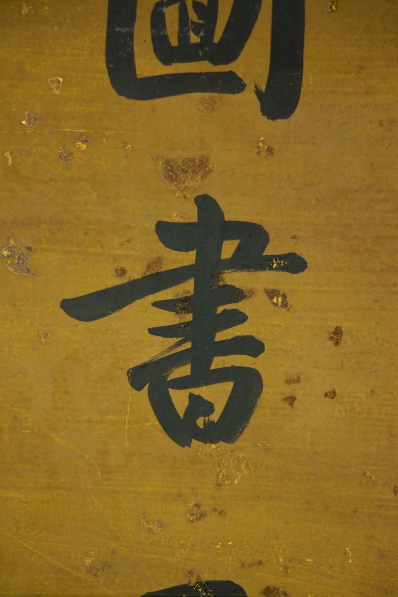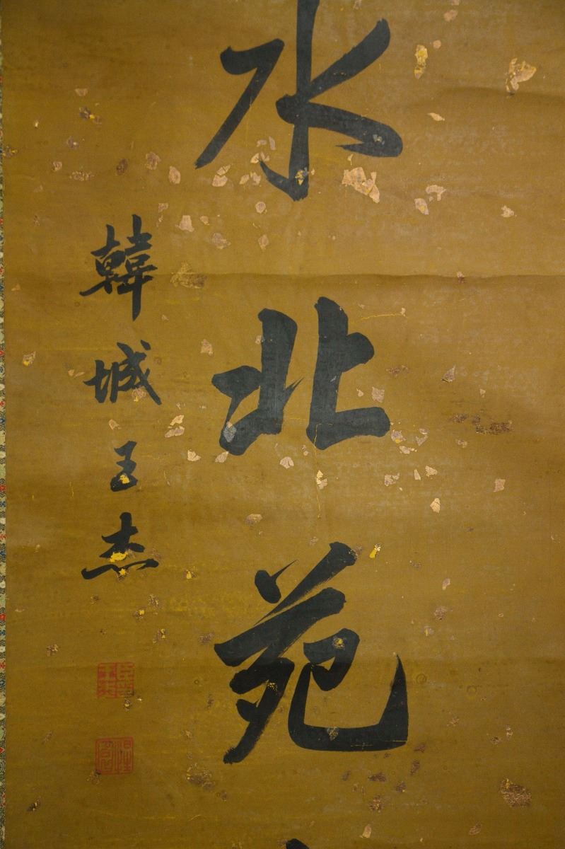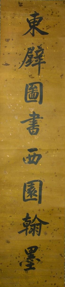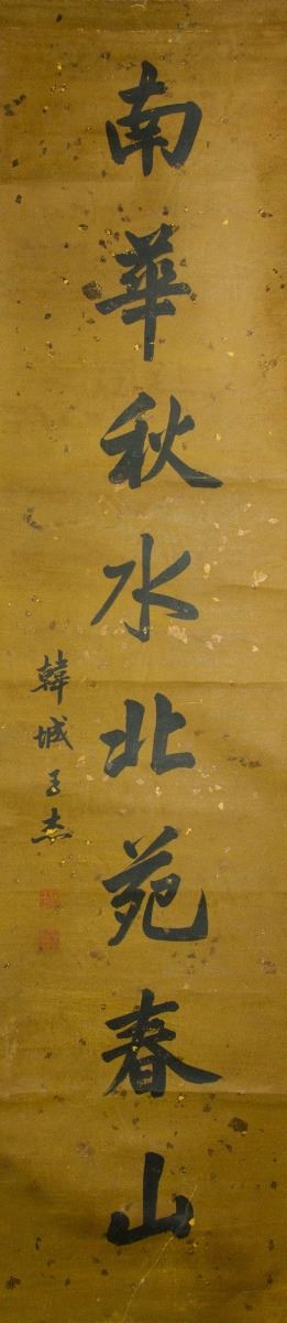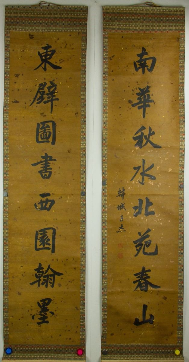 Calligraphy couplet; Chinese ink on paper; two hanging scrolls; signed Wang Jie and inscribed with two artist seals; 191 cm ? 45 cm each