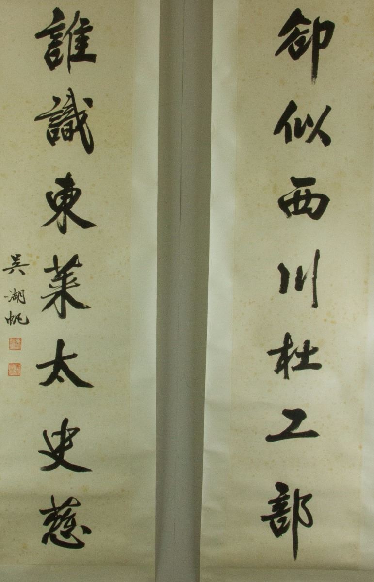Calligraphy couplet; Chinese ink on paper; signed Wu Hufan and inscribed with one artist seal; 133 cm x 30 cm each