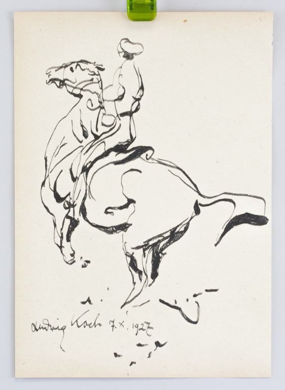 Ink on paper. Featuring ink sketch of a man on a horse. Signed "Ludwig Koch" to the bottom left, with date 1927. 30 x 20.5 cm (11.7 x 8.3 inches).