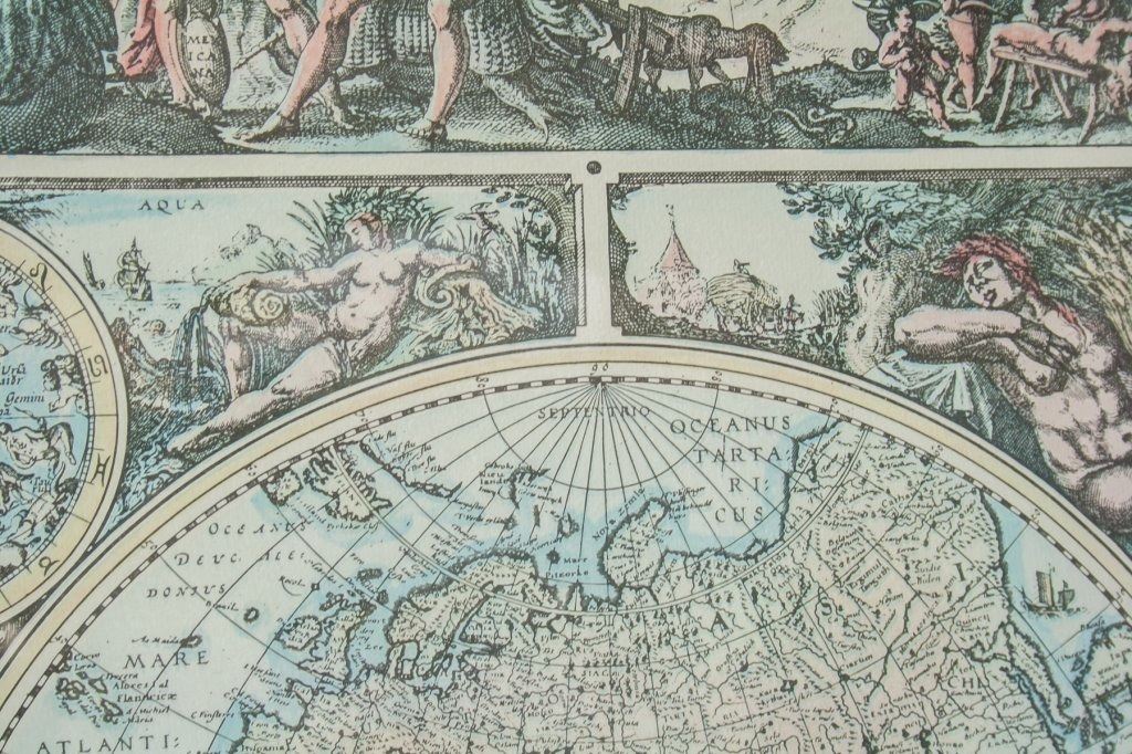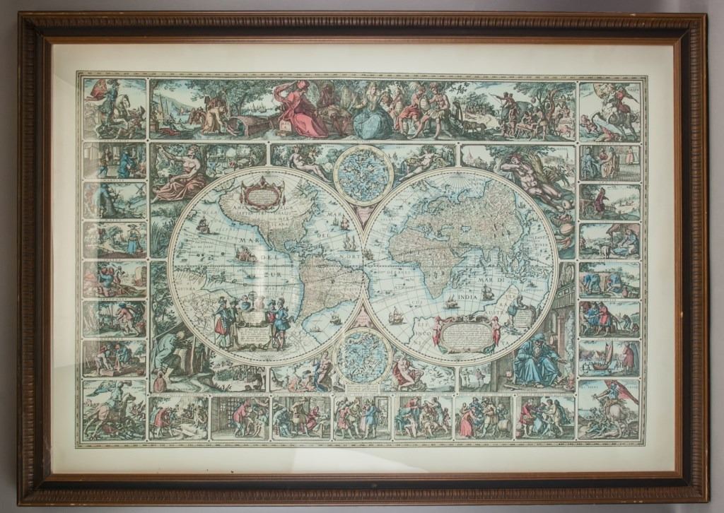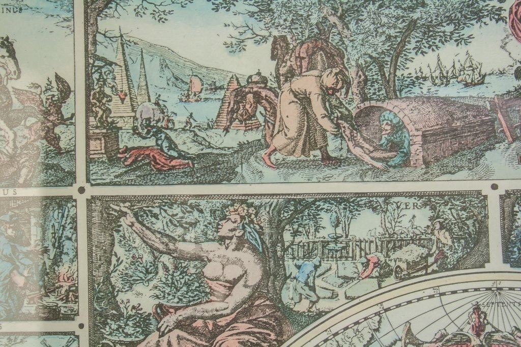 Ink on paper, framed. Featuring world map with images of different months and events around the edge. 49 x 89 cm (19.5 x 35 in), Frame: 77 x 99 cm (30.5 x 39 in).