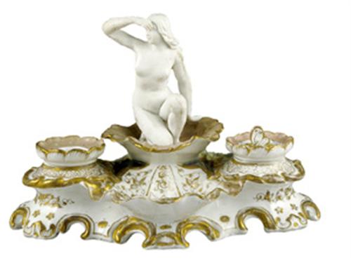 Porcelain, colour paint and gilt. In the middle nymph kneeling in a shell. Minor repair. Marked: Prague, mid 19th century. Size: 16.5 cm, length: 25 cm