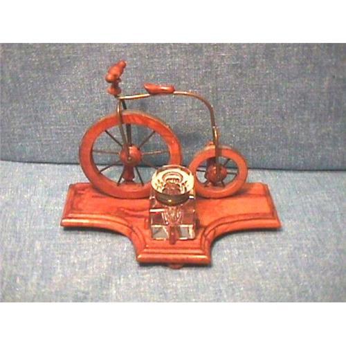 This fine detailed unusual Olive Wood item is in the shape of a small Penny Farthing Bicycle, containing a special space for the glass inkwell and spaces for two pens. The bicycle wheels revolve when removed from their special pins.