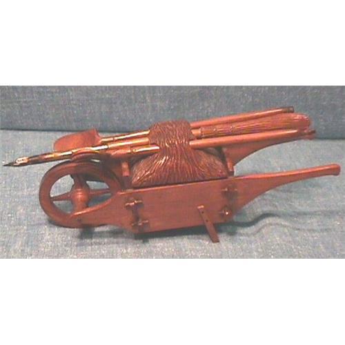 This fine detailed unusual Olive Wood item is in the shape of a small Wheelbarrow, containing a special space for the glass inkwell and spaces for the three farm tools, which have been converted into writing instruments. The Wheel revolves.
