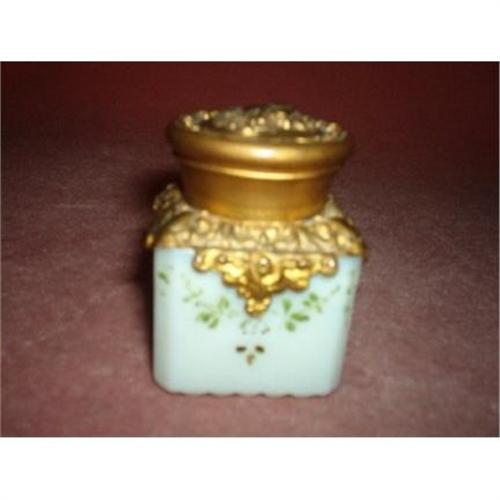 Measuring 1.5" square and2" tall this pretty milk glass inkwell has a gilded metal top..The milk glass is hand painted with green foliage. Circa 1920