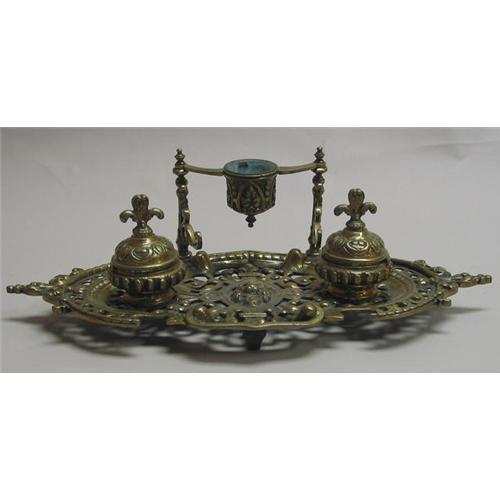 French Solid Brass Triple Ink and Pen Stand with