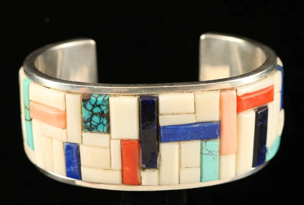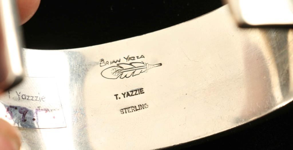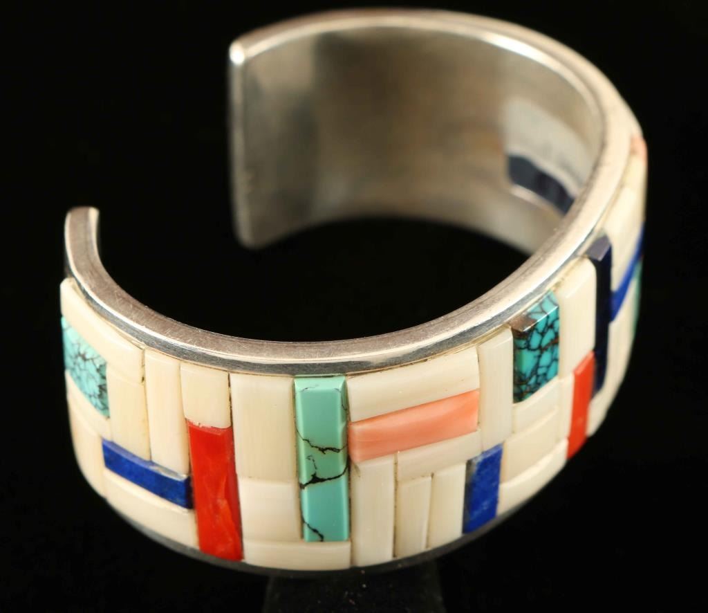 Made by T Yazzie, maker marked with bone, turquoise, coral, lapis all set in sterling silver.
