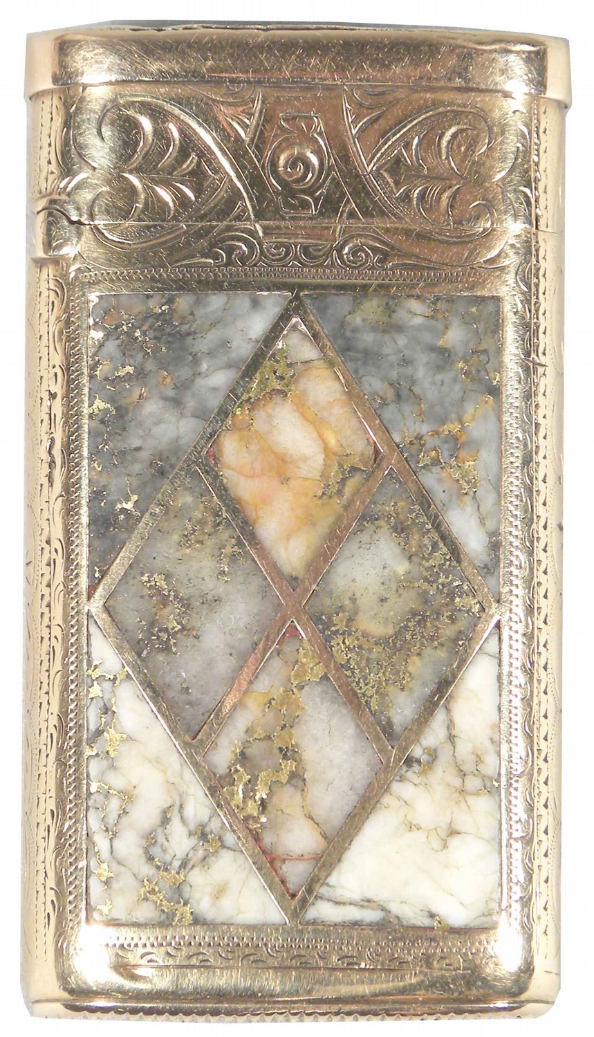 Inlaid Gold Quartz Match Safe. Multi-colored diamond pattern. Dark grey, lt grey, pink and white w/grey on top. Engraved detail throughout, heavier than most of these style safes. Excellent original condition. 1 1/4X 2 1/4 inches.
