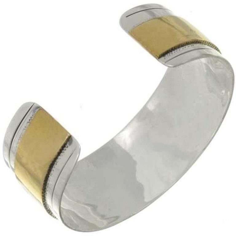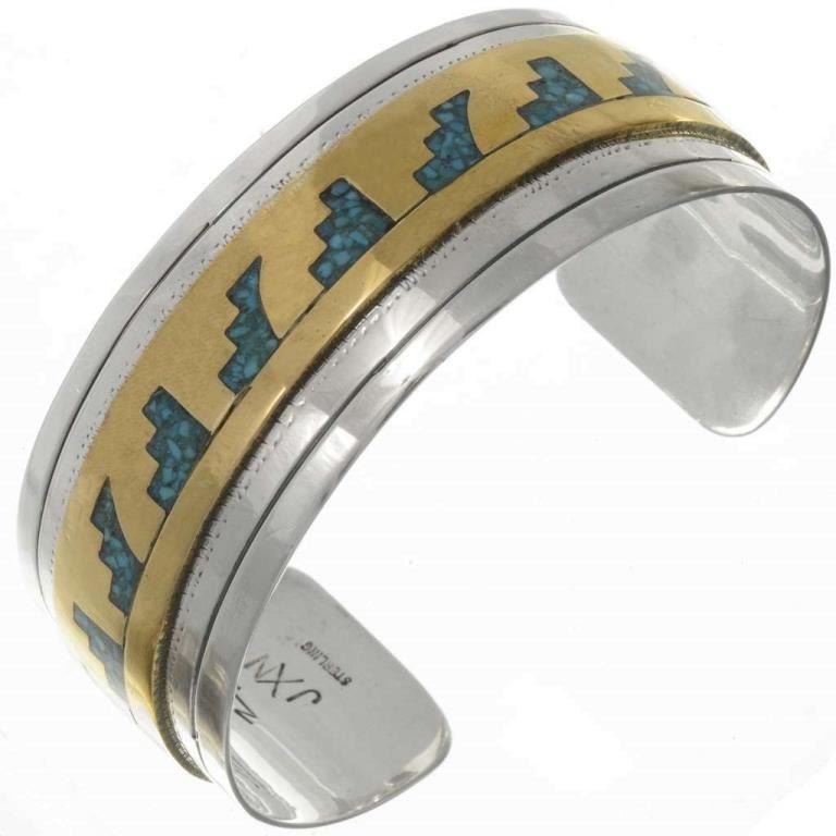 Depicts a Hopi kiva step pattern. Jeweler's Gold is inlaid with genuine Turquoise chips and soldered to a 1" wide Sterling bracelet that is hammered with linear designs. Stamped Sterling and hallmarked.