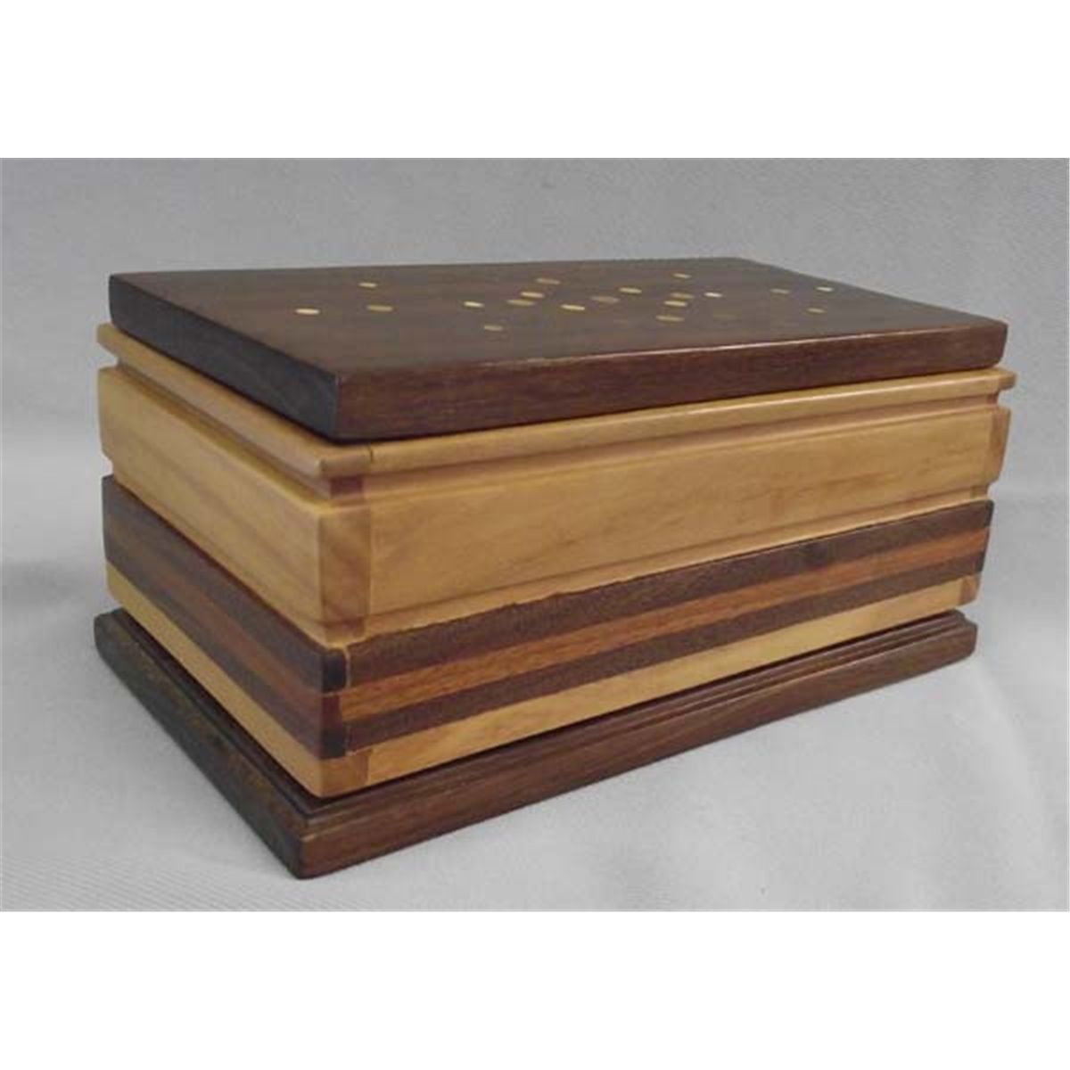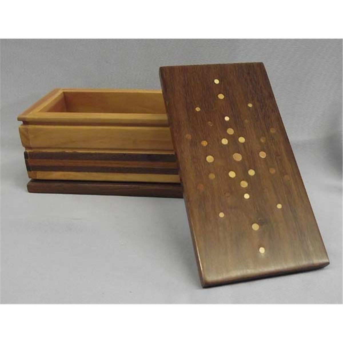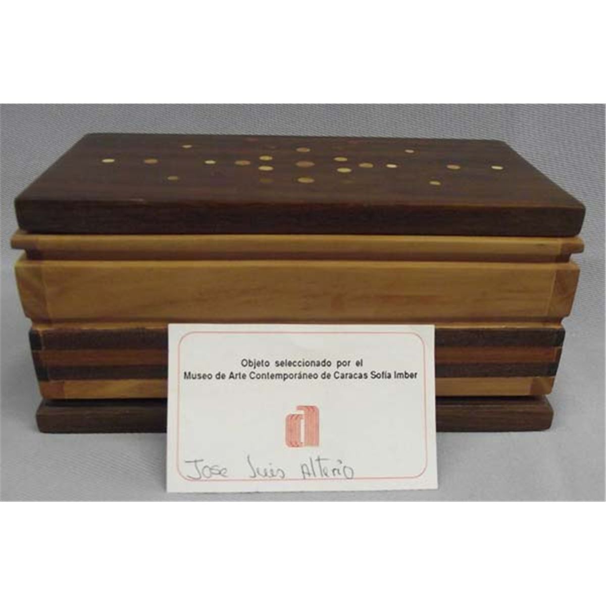 Inlaid Lidded Wood Box from Venezuela Museum. Card with box indicates the box is from the ''Museo de Arte Coontemporaneo de Caracas Sofia Imber'' and the artist's name is hand written on this card ''Jose Luis Alterio.'' There is a hallmark on the bottom of the box. The box measures 7''Wx3-3/8''Dx3-1/8''H with the lid on. Buyers Pay Actual Shipping and Handling Charges(see terms and conditions for more information).