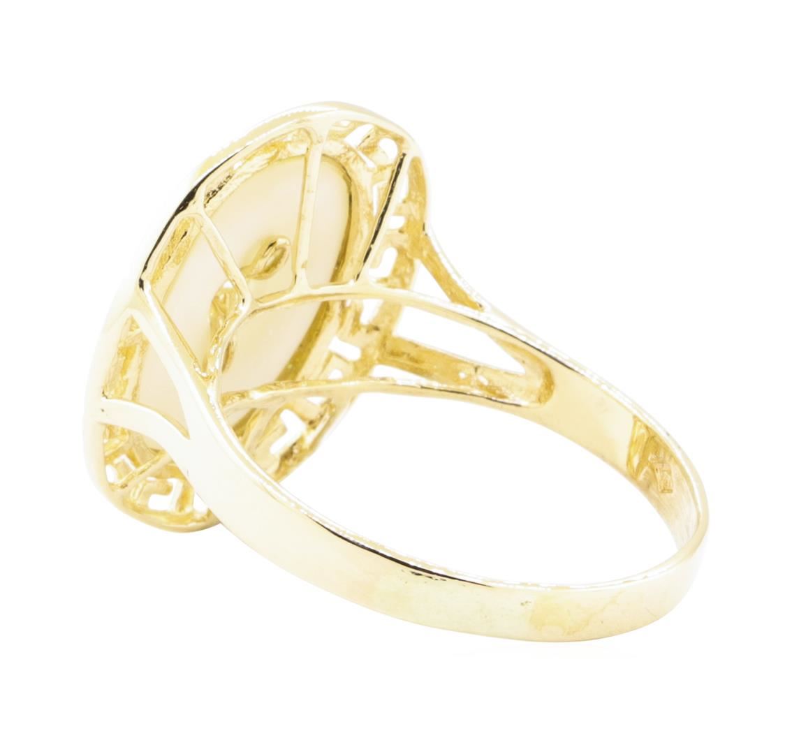 One ring featuring: 14KT yellow gold weighing 4.6 grams containing one inlaid oval piece of mother of pearl measuring 16mm by 12mm.