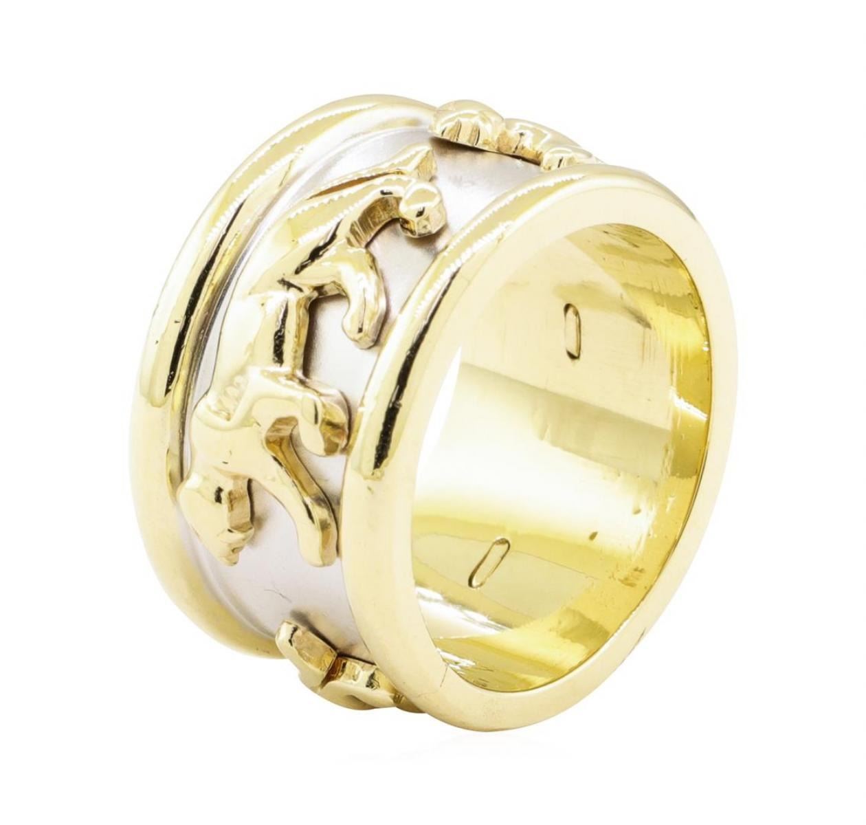 One ring with four panther motifs featuring: 14KT yellow and white gold weighing 14.9 grams.