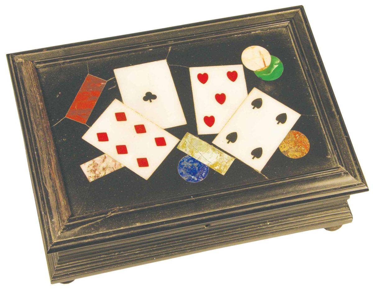 Inlaid Playing Card Box for two decks. Wood and catalin. A few minor age cracks on top otherwise good condition. 7 1/2 X 5 1/4 X 2 3/4 inches.