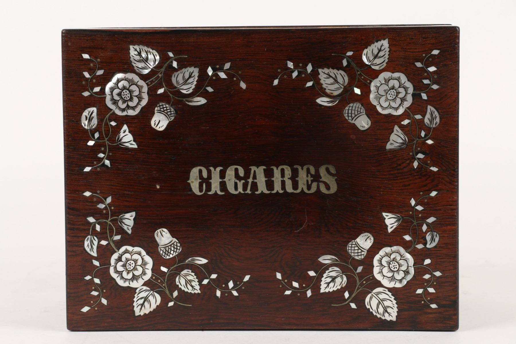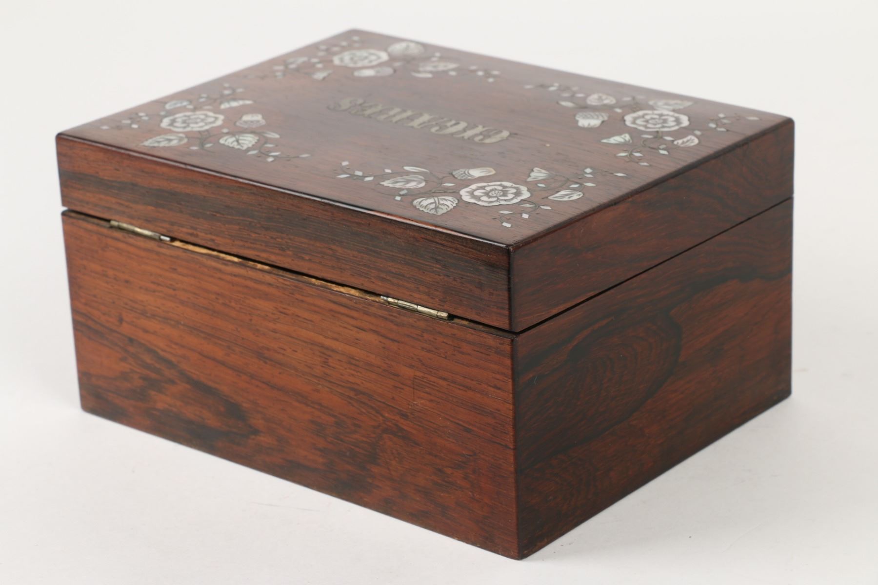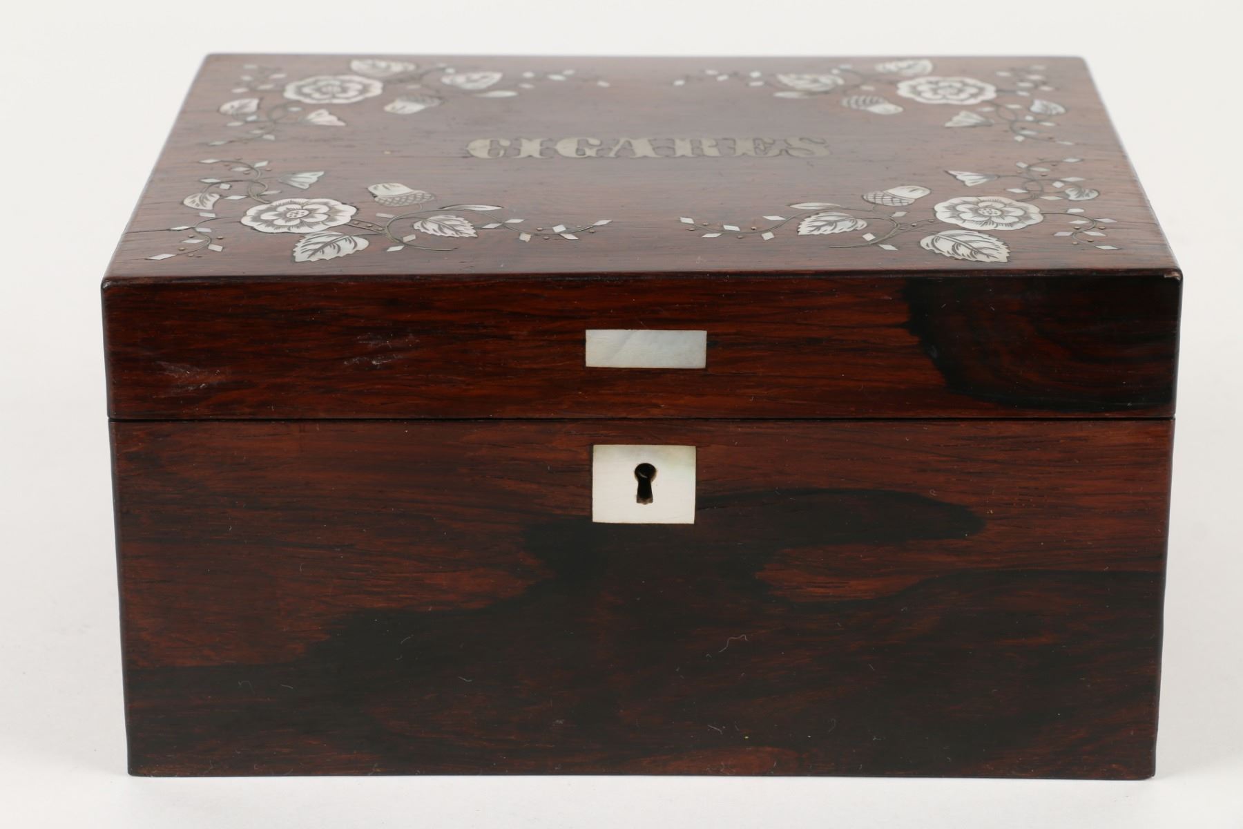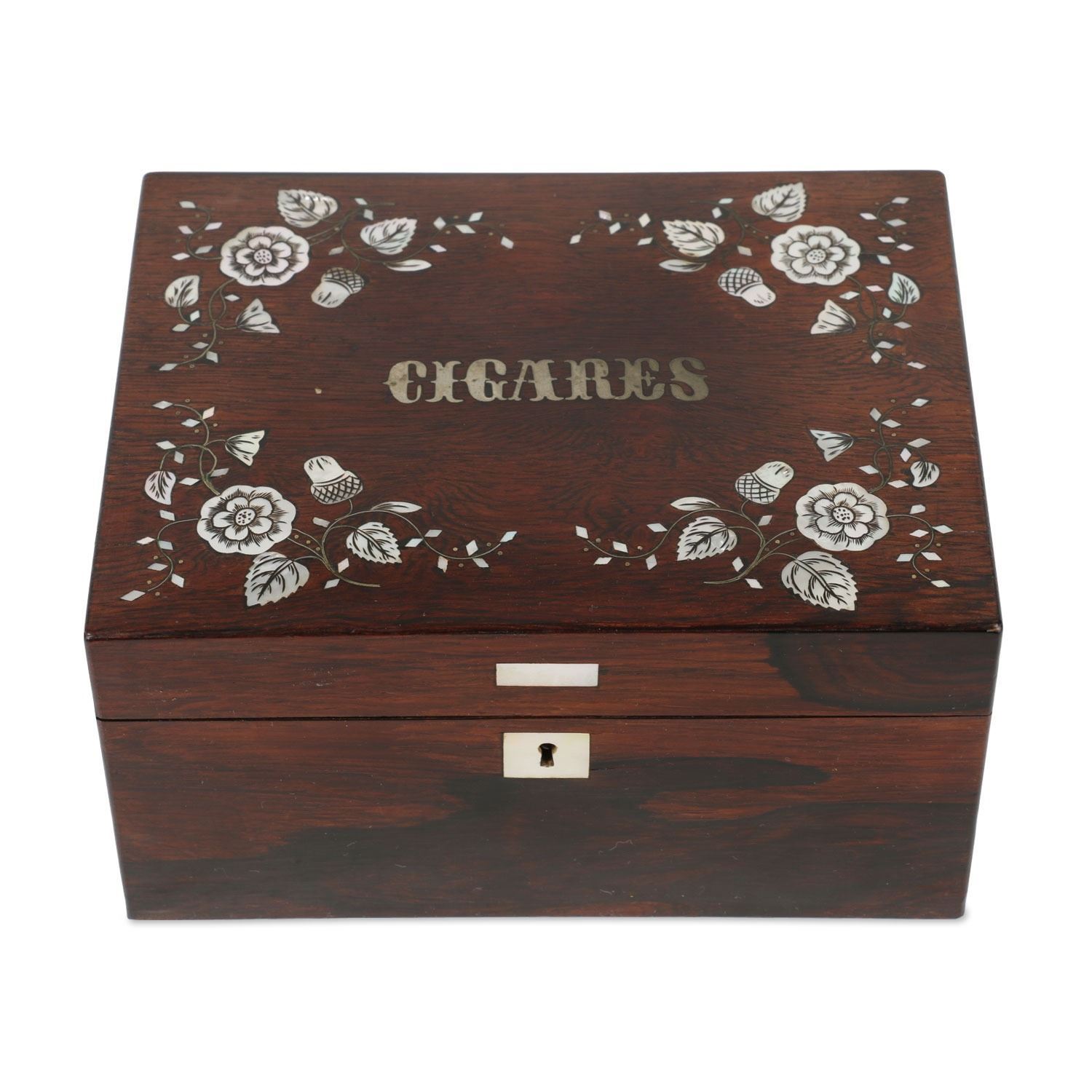 Lot 396 - "CIGARES". Inlaid Rosewood. Crochet interior decoration. Foil lined. 4" x 7.5" x 5.75". $100-200.