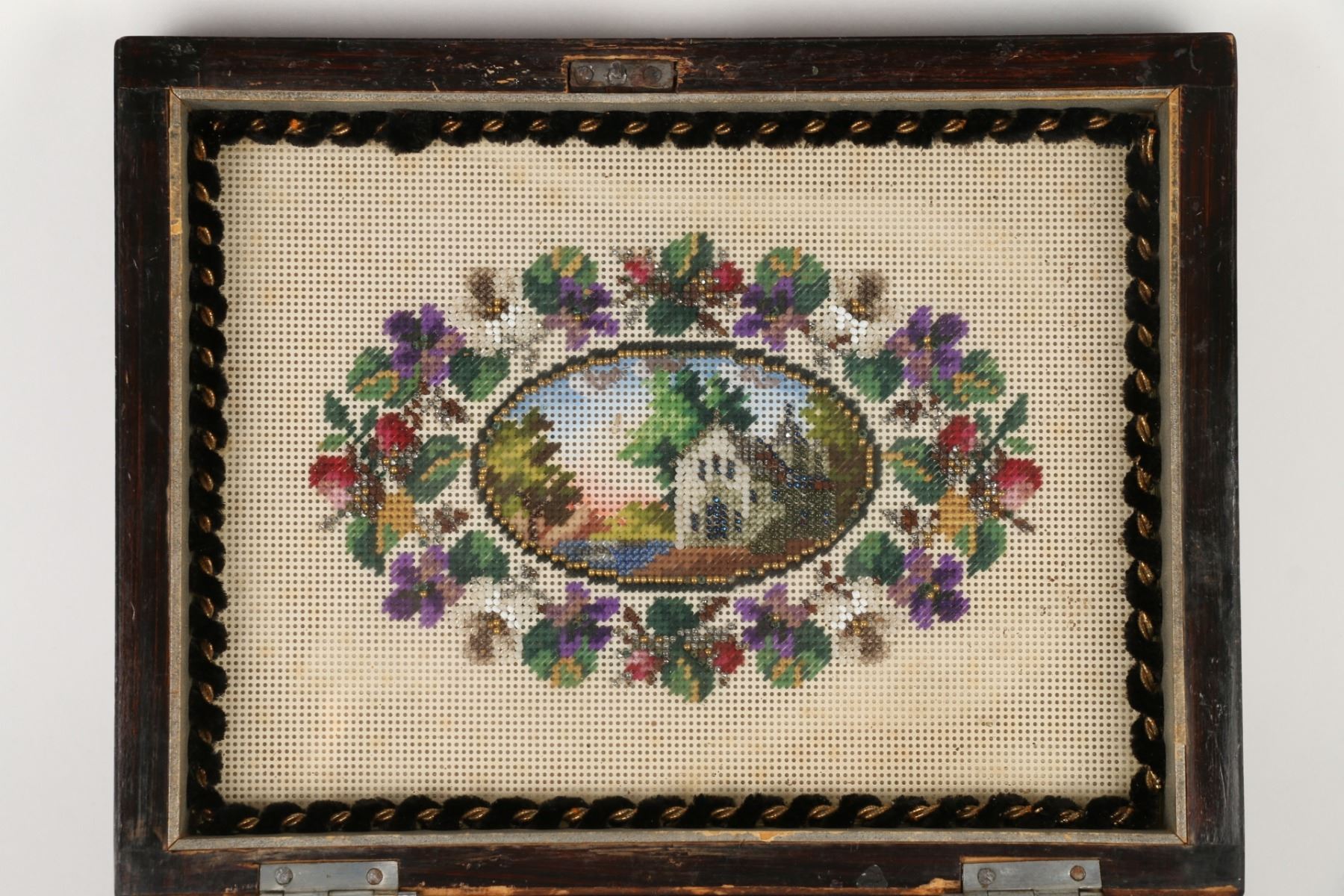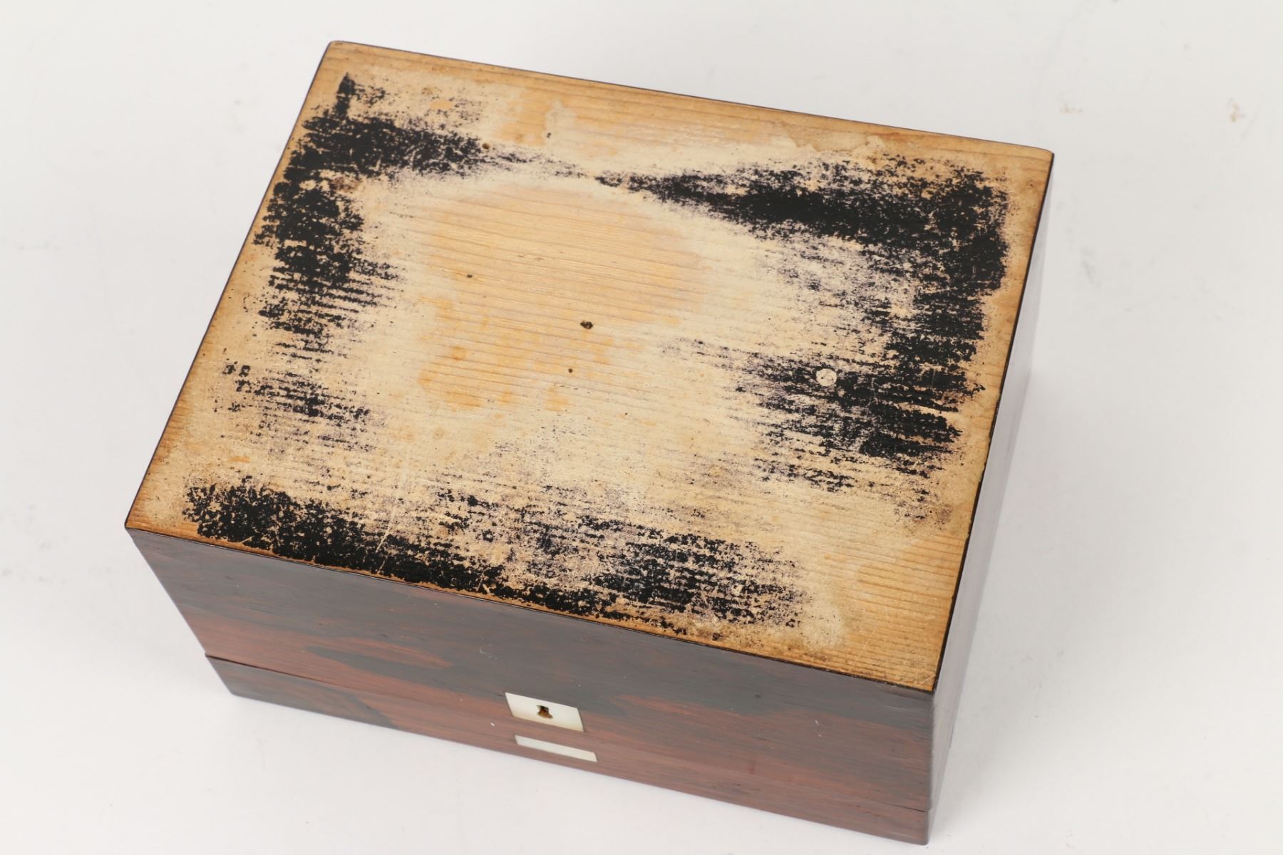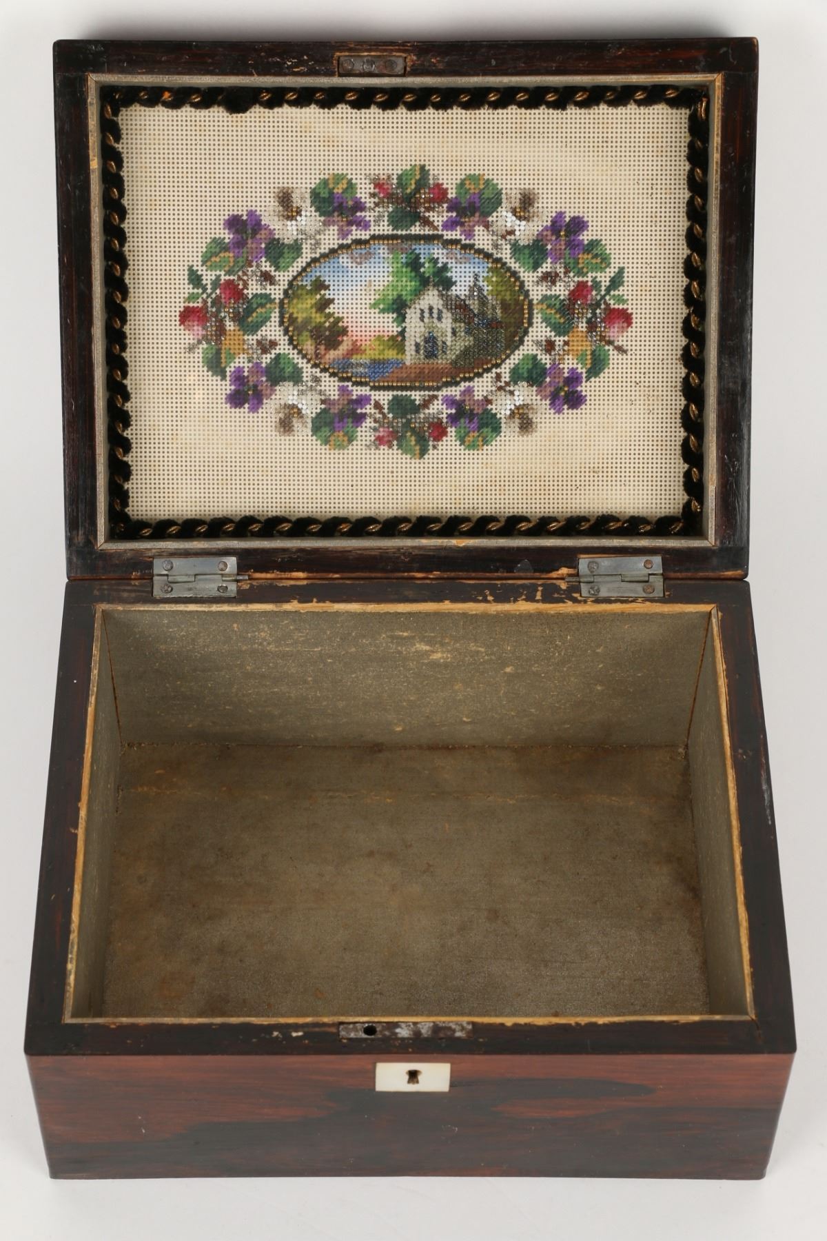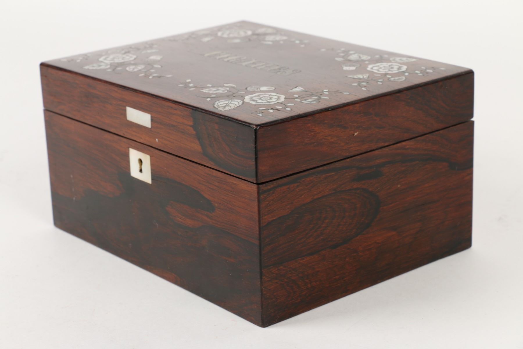 Lot 396 - "CIGARES". Inlaid Rosewood. Crochet interior decoration. Foil lined. 4" x 7.5" x 5.75". $100-200.