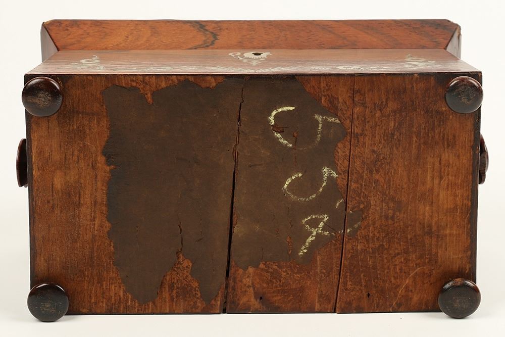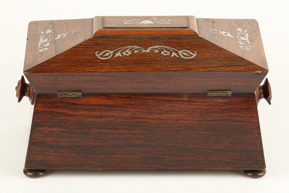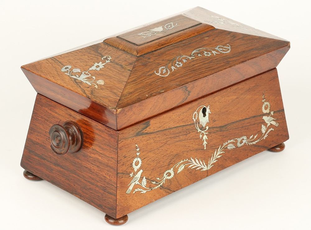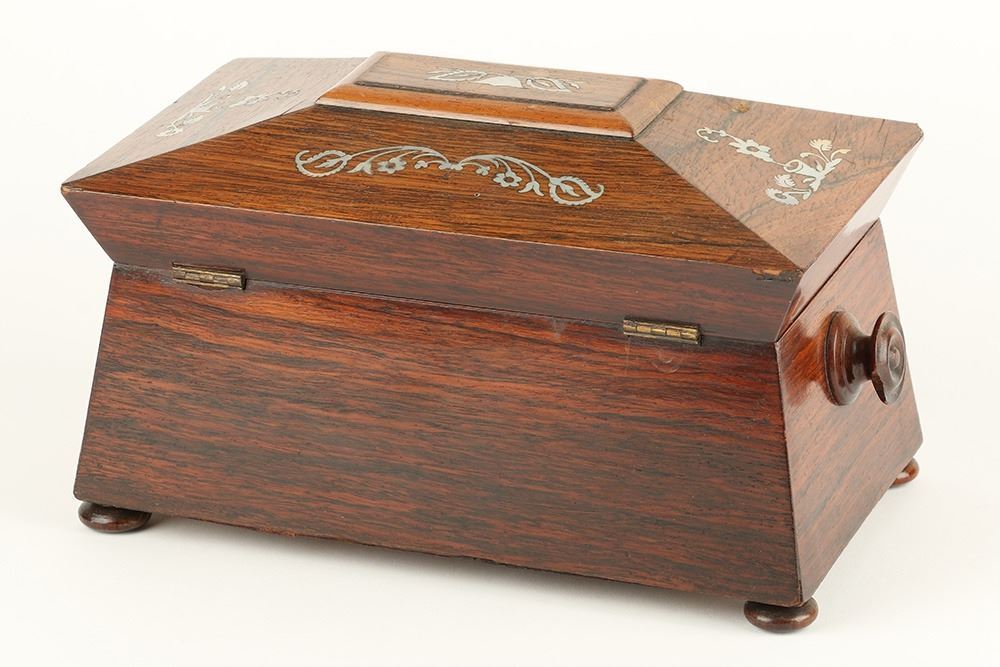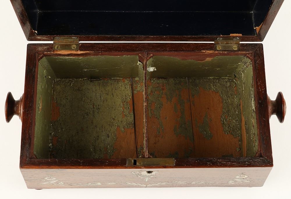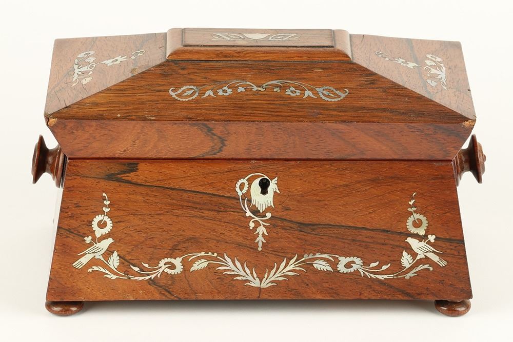 Lot 146 - Sarcophagus form. Bird marquetry. Retains remnants of original foil lining. Both interior covers in place. 11" x 6" x 5.5". Minor veneer loss, particularly lower edge. Loss to turned pulls. $200-300.