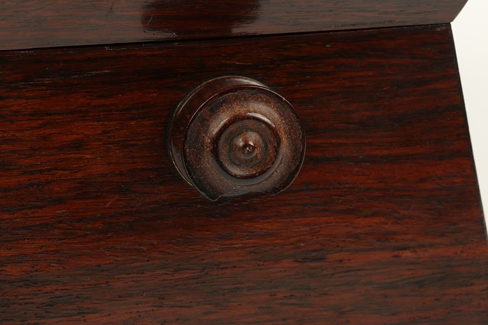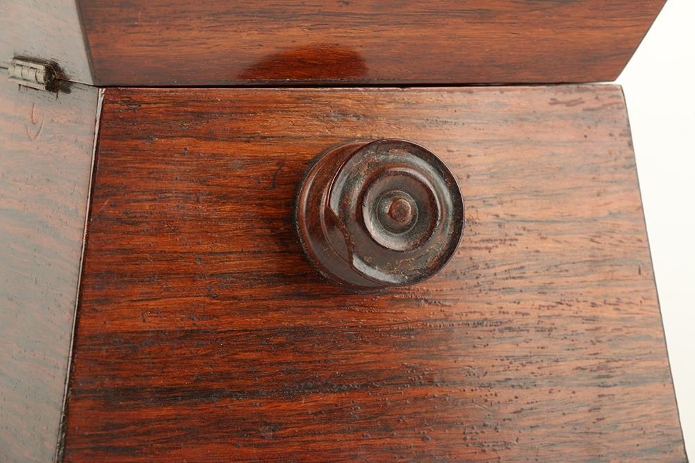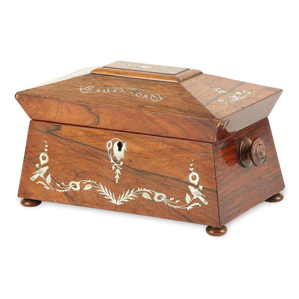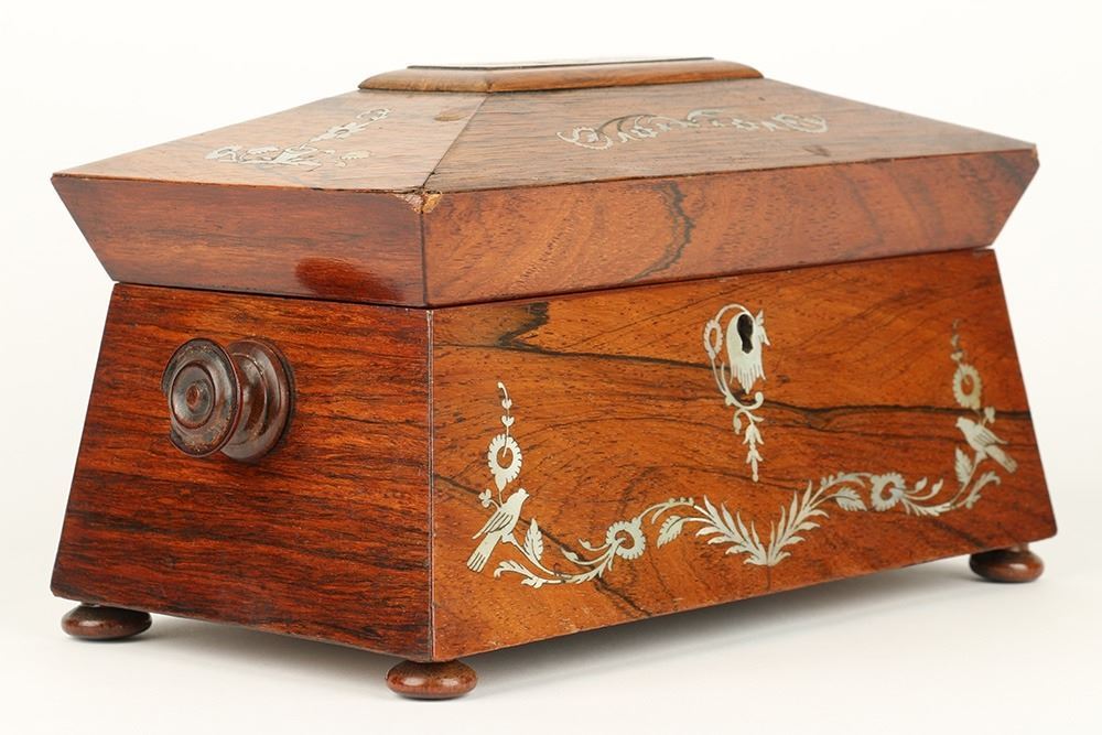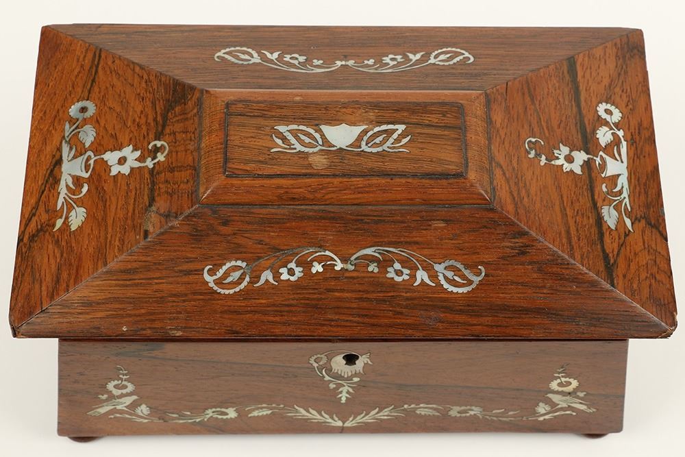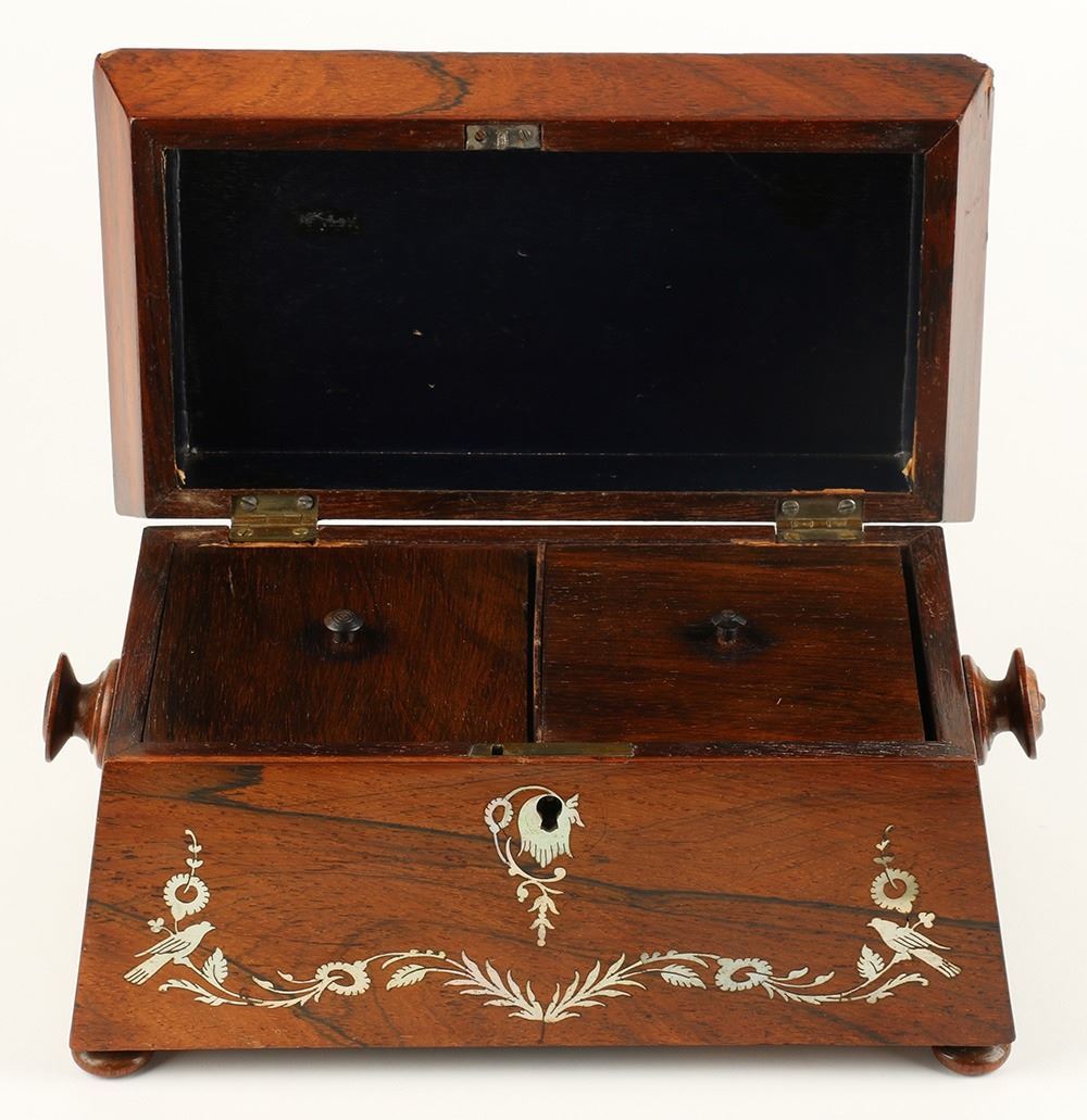 Lot 146 - Sarcophagus form. Bird marquetry. Retains remnants of original foil lining. Both interior covers in place. 11" x 6" x 5.5". Minor veneer loss, particularly lower edge. Loss to turned pulls. $200-300.