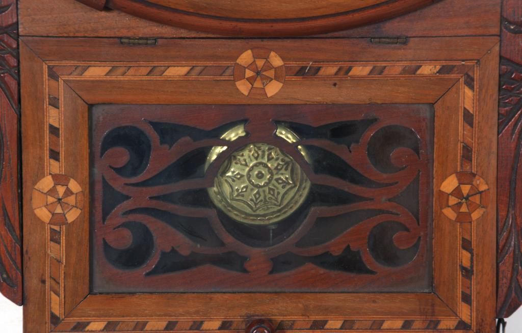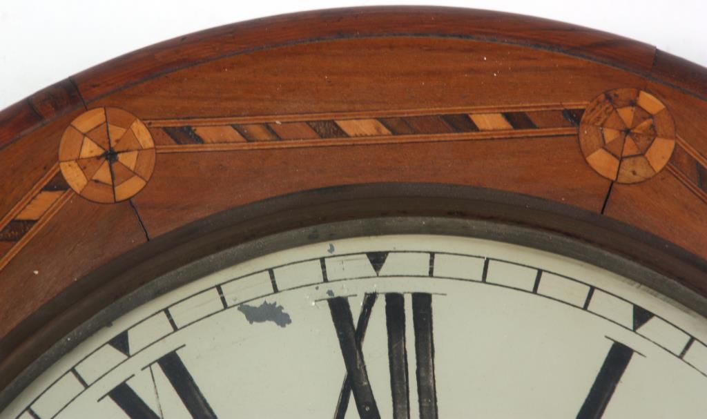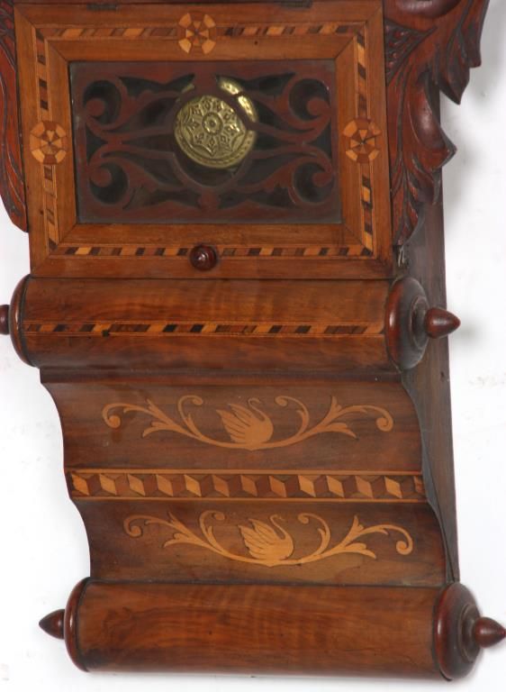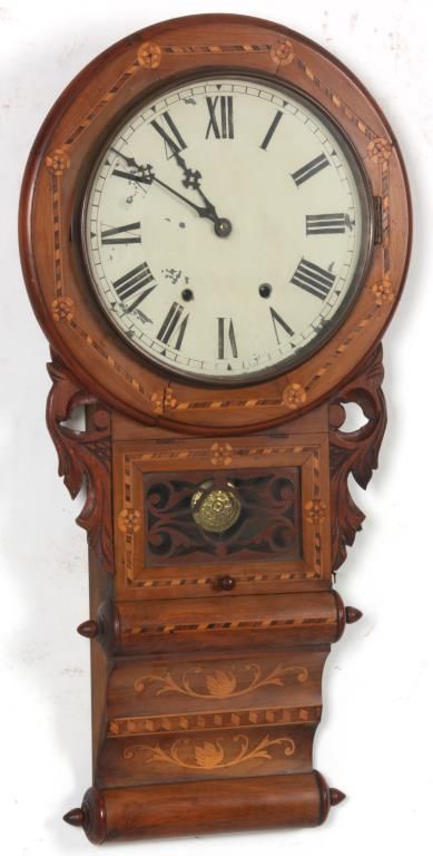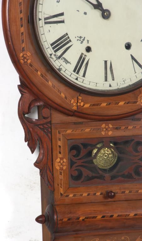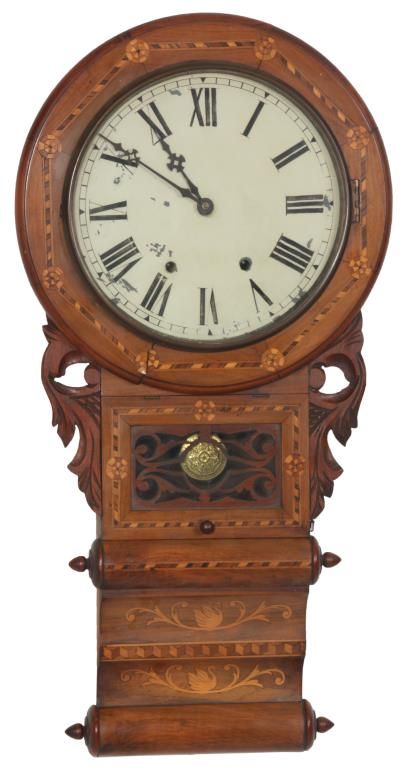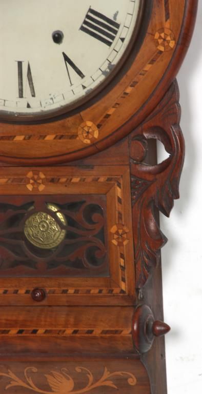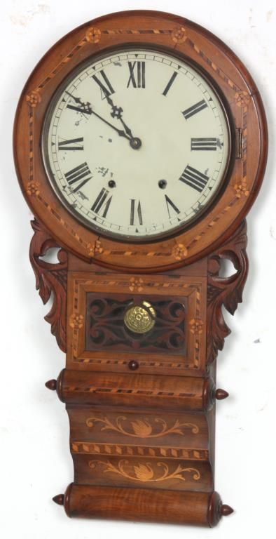 Inlaid Schoolhouse Hanging Regulator. Original 12 in. painted metal dial has black Roman hour numerals, original pierced hands and brass door bezel with original glass; brass 8 day spring driven movement is signed with New Haven Trade Mark, hour countwheel strike mechanism with steel bell and brass covered pendulum bob. In a walnut case with marquetry inlays around the door bezel, a serpentine double long drop with filigree carved side corbels, turned side rosettes with finial and additional inlays. In good condition and original finish. 32 in. high x 16 in. wide x 4.5 in. deep.
