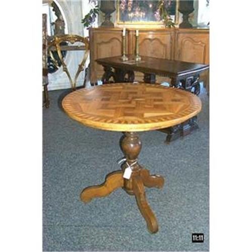 This is an inlaid, small round game table from France. It is in very good condition, and we believe it to be from around the 1950's. The top is parquet, and the material is French walnut wood. H=29 5/8, Diameter=32 3/4. Please contact us for more pictures. Thank you-Le Louvre