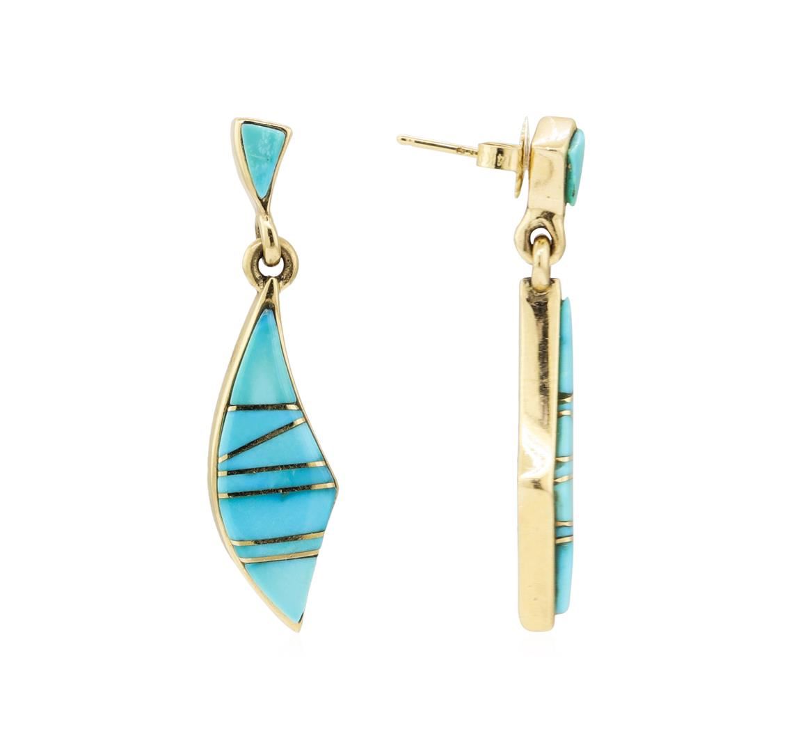 One pair of dangle earrings with friction posts and backs featuring: 14KT yellow gold weighing 6.5 grams containing inlaid turquoise.