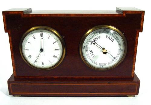 Inlaid mahogany cased mantle clock with barometer, the body inset with two enamel dials, 20cm high