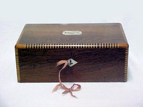Inlaid rosewood lap desk; rectangular top with mother of pearl inlay in center inscribed Adele; inlay design around rim of top and corners of box; mother of pearl escutcheon; hinged lid; interior with hinged writing surface; ink bottle and accessories; me
