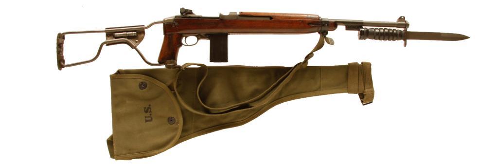 Inland Div M1A1 Carbine Cal .30 Carbine SN:7008496, M1A1 Paratrooper Carbine made by Inland Division of General Motors with fold out stock. Third type with bayonet lug and standard rear sight. Barrel marked "Inland Mfg. Div." Parkerized finish, standard hard wood folding stock and hand guard, 18" barrel, good bore and action. Condition: Good to very good. Stock has been neatly repaired below the hand guard. Stock cartouche RIA over EB in box, pistol grip stamped with P in circle. Includes U.S.M4 knife and green canvas scabbard marked U.S.