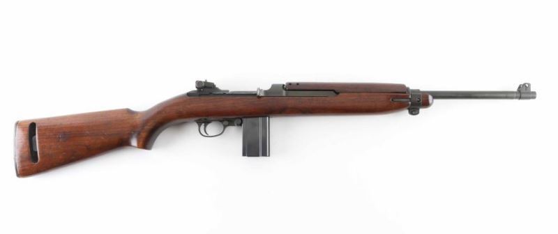 US military semiautomatic rifle manufactured circa mid-1944. Features parkerized finish, walnut stock & handguard, protected blade front sight, peep rear sight with sliding elevator, 18" barrel, push button manual safety, front sling swivel, wide front band without bayonet lug, sling slot in butt, accepts detachable magazine. Round top bolt, four rivet handguard. Bore is good to very good condition, might improve with cleaning. Retains 85% finish, colors and textures consistent with US military arsenals, shows loss on edges and where moving parts rub, scratches on barrel. Wood is very good condition with minor dents & dings, varnished. Markings include "INLAND 8-44" on barrel, crossed cannons on right of butt. No importer marks observed. Includes one very good condition blued steel magazine marked "IU". Condition is NRA Very Good (arsenal rebuild) *** C&R Firearm ***