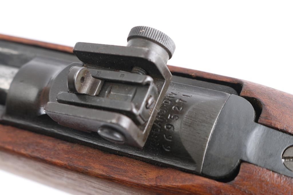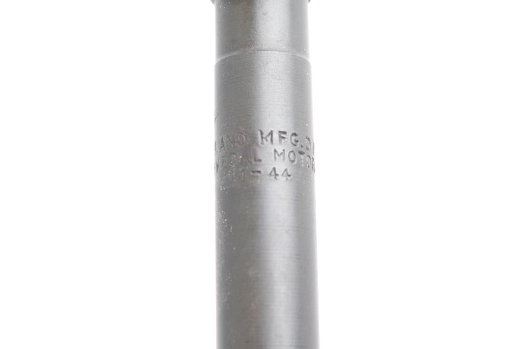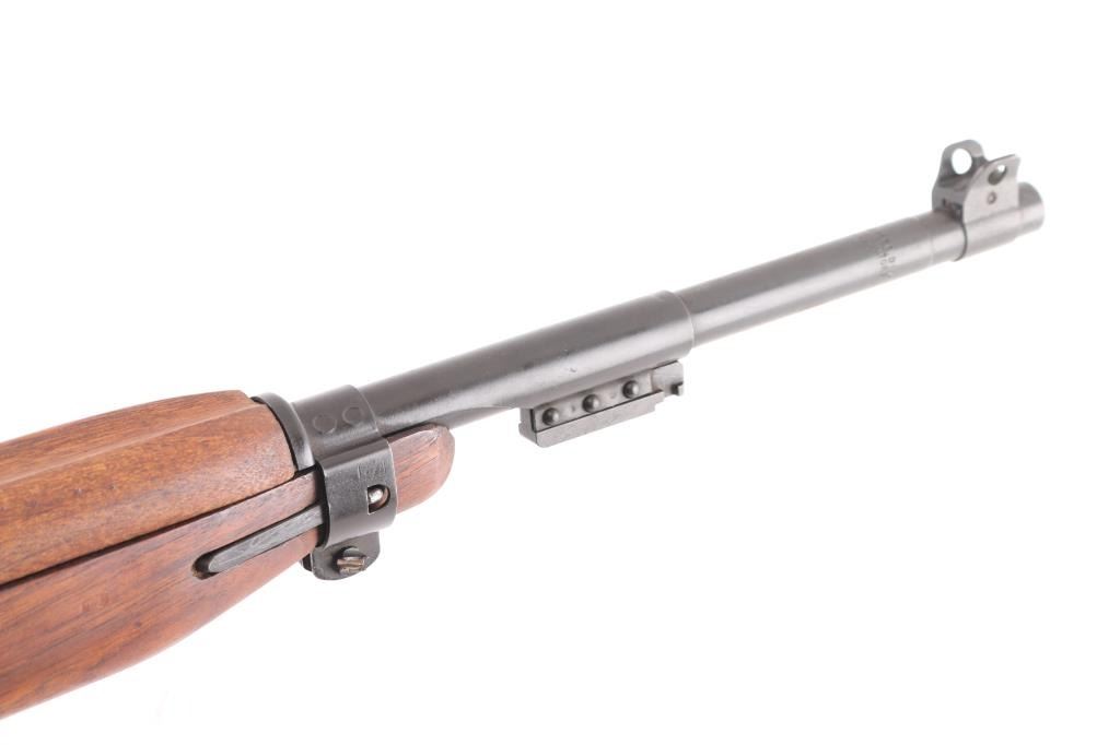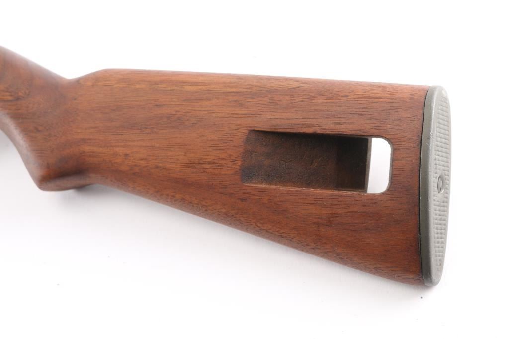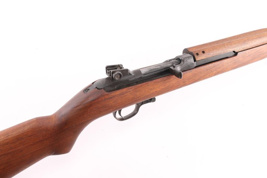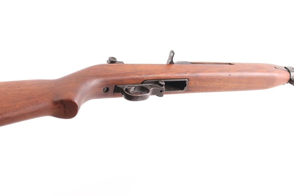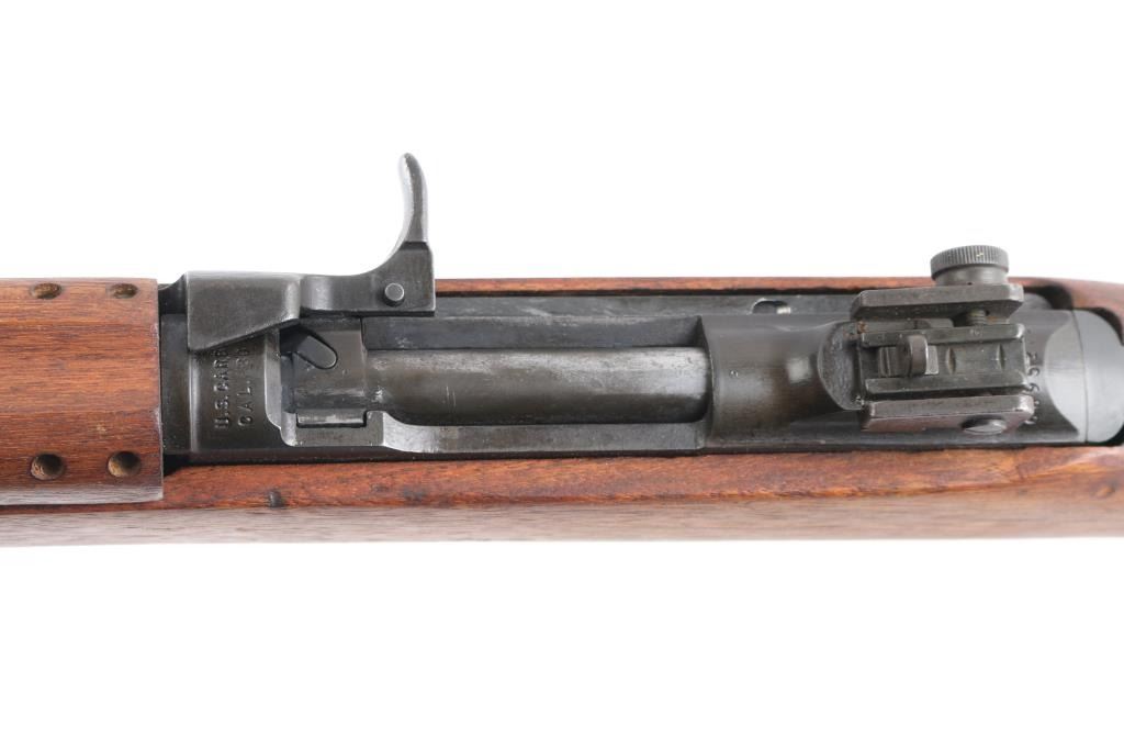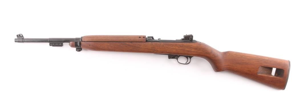 US military semiautomatic rifle manufactured circa 1944. Features parkerized finish, walnut stock & handguard, protected blade front sight, peep rear sight with sliding elevator, marked 'PI' (Inland)18" barrel, push button manual safety, front sling swivel, oval sling slot in butt, accepts detachable magazine. Type III barrel band with bayonet lug, marked 'KI' (Inland). Late war type III round top bolt, four rivet handguard,low wood stock. 'IR' stamped in the sling well. (Robert Irwin Co. late war replacement stock). Bore appears excellent/bright. Retains 92% finish, colors and textures consistent with US production or US military arsenals, shows loss on edges and where moving parts rub, friction wear on the bolt. Wood is near excellent, Markings include "INLAND MFG. DIV. GENERAL MOTORS 11-44" on barrel. Inland marked receiver. No importer marks observed. No Magazine.