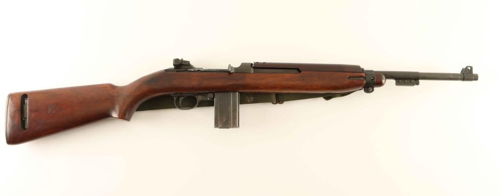 WWII era U.S. military magazine fed semi-automatic service rifle chambered in .30 Carbine, manufactured circa 1945. Features a parkerized finish, 18" Inland barrel dated 11-44, shrouded blade front sight, sliding adjustable rear aperture sight, wide barrel band with bayonet lug, four-rivet hand guard with narrow groove, push button safety, push button magazine release, 15 round magazine, smooth trigger, milled triggerguard, round bolt, green canvas sling, oiler, and smooth walnut pistol grip shoulder stock with low-wood forend, oval cut oiler slot, & textured metal buttplate. Markings: Front Sight - "N" Barrel Band - "KI" Rear Sight - "I.R. CO." Operating Slide - underlined "PI", "A" & "7160091" Bolt - "1" & "I.O." Trigger Housing "INLAND" logo Hammer - "H.I." Magazine Catch - "M" & "SI" Magazine - "I.I." inside a circle. Forend - "OI" Stock - "H.I." Rifle exhibits approximately 90% of it's original parkerized finish showing action wear on the bolt & receiver, light handling wear and scattered dried grease. Action is smooth, the four land bore is excellent and the wood stocks are very good with a repair on the right side of the wrist. Condition is NRA Very Good+. ***C&R Firearm***