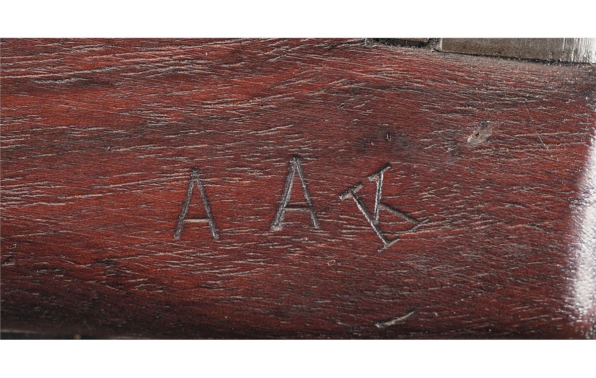 Manufactured in the first block of serial numbers circa late 1942. The barrel is stamped "INLAND MFG. DIV./GENERAL MOTORS/5-43". It has the type 3 barrel band/bayonet lug stamped "KI", low wood M1A1 style stock stamped "AAK" on the left side with leather cheekpiece and buttplate with cast markings, a 4 rivet handguard, a straight faced slide, a round bolt, "M" marked magazine release, a flip safety switch and an adjustable milled rear sight. There is a crossed cannon cartouche on the bottom of the vertical grip and a "P" on the front. With a wrapped 10 round magazine.